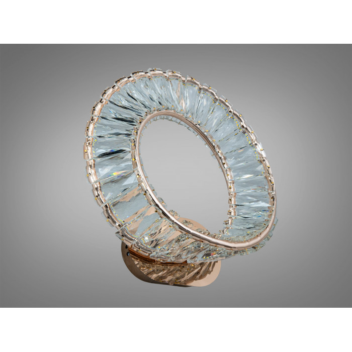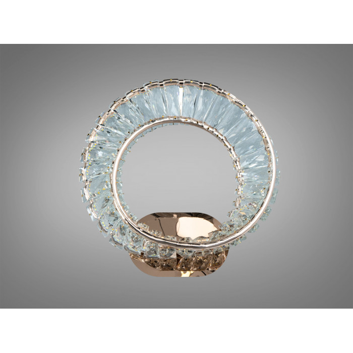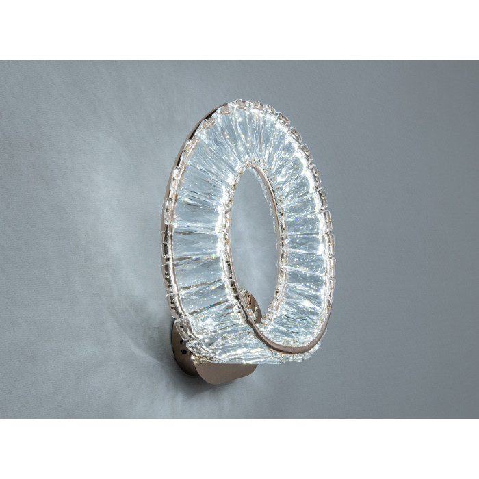 Це настінне бра зі світлодіодним модулем 42 Вт поєднує теплий відтінок золотого металу з прозорими кришталевими елементами. Світильник утворює м’яке розсіяне світло з декоративними відблисками на стіні, що сприймається як акуратне акцентне підсвічування. За формою модель тяжіє до сучасної геометрії з плавними лініями, тому органічно виглядає в мінімалістичних і модерних просторах. У лінійці також є версія в хромі (як окремий варіант), тож легко підібрати тон під фурнітуру або змішувачі.