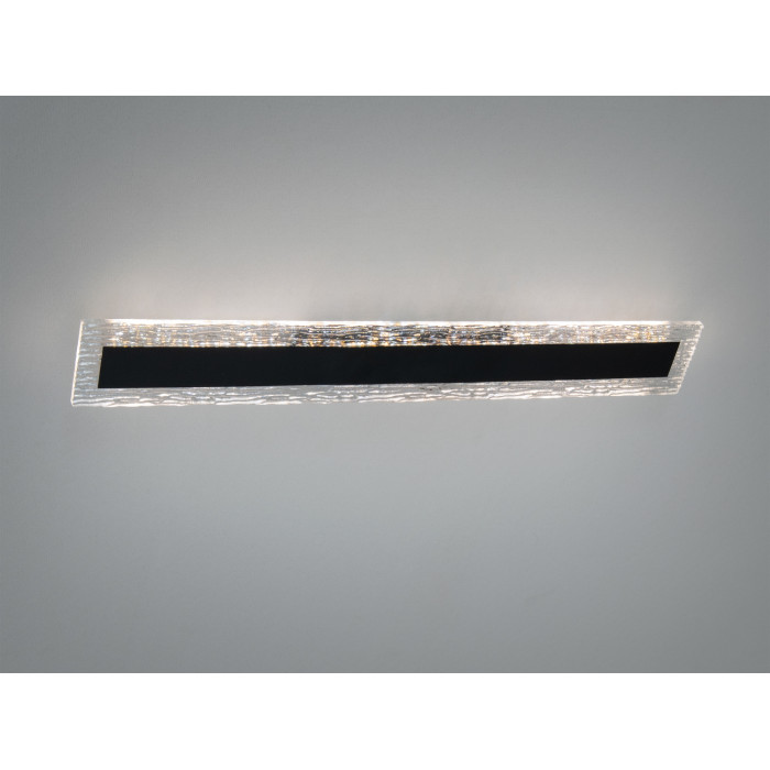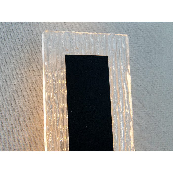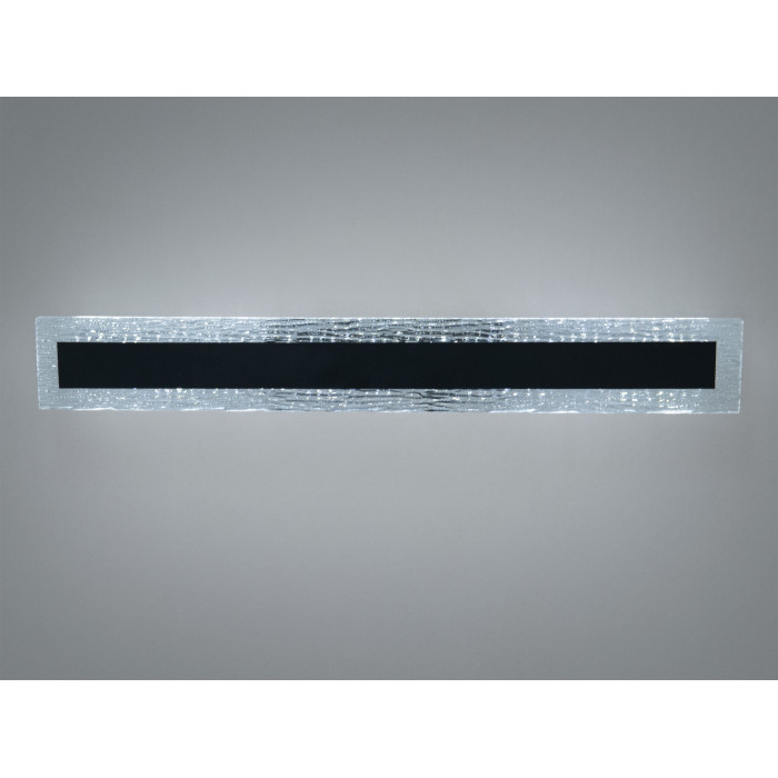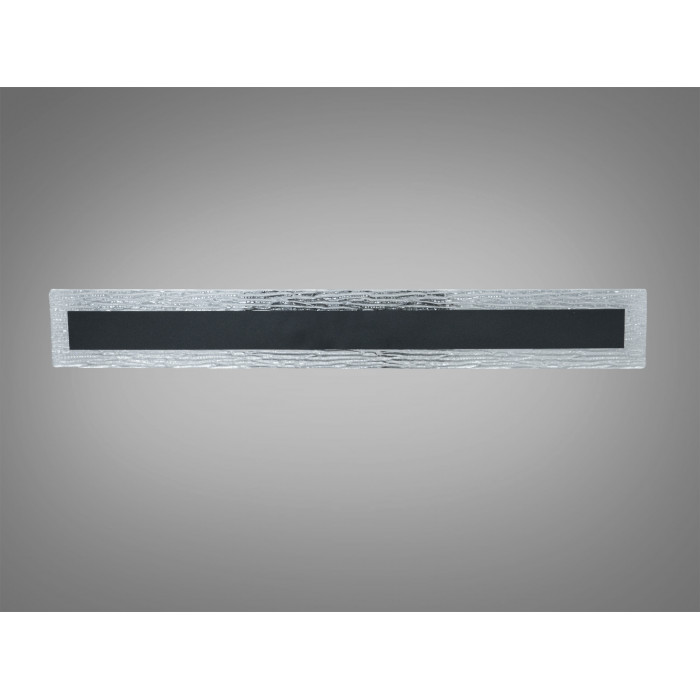 Настінний LED світильник бра-планка 28 Вт у чорному кольорі створює виразну світлову лінію та акуратний акцент на стіні. Подовжений прямокутний корпус поєднує текстуроване прозоре скло та матовий чорний центральний елемент, що допомагає спрямовувати й пом’якшувати світло. Модель орієнтована на сучасні інтер’єри у стилі мінімалізм і доречно виглядає як окрема світлова деталь або як частина композиції з декількох світильників уздовж стіни.