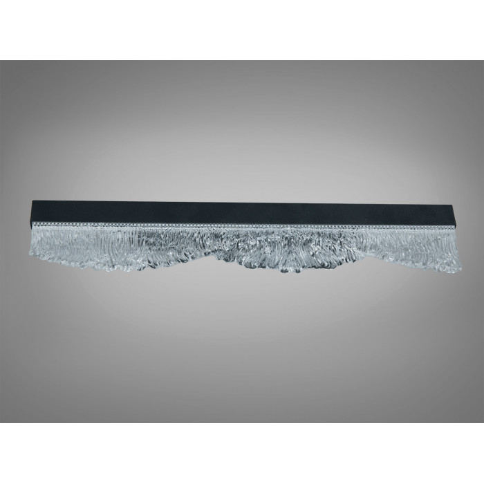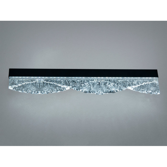 Завдяки поєднанню чорного металу та прозорого рельєфного скла цей настінний LED світильник допомагає сформувати м’яку світлову сцену і підкреслити фактуру стіни, не перевантажуючи інтер’єр деталями. Формат бра-планки натякає на лінійний акцент, який може об’єднати композицію кімнати та додати їй глибини.