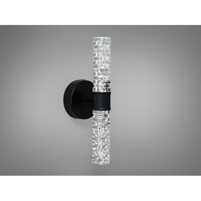 Це настінний LED світильник зі скляним циліндричним плафоном і чорним металевим кріпленням, який пропонує виважене акцентне світло для сучасних інтер’єрів. Вертикальна орієнтація та прозоре скло з легкою текстурою або мікробульбашками формують спокійний променевий малюнок на стіні. Потужність близько 5 Вт підходить для підсвічування зон, ніші, дзеркала чи як нічне світло біля ліжка, не перевантажуючи простір.