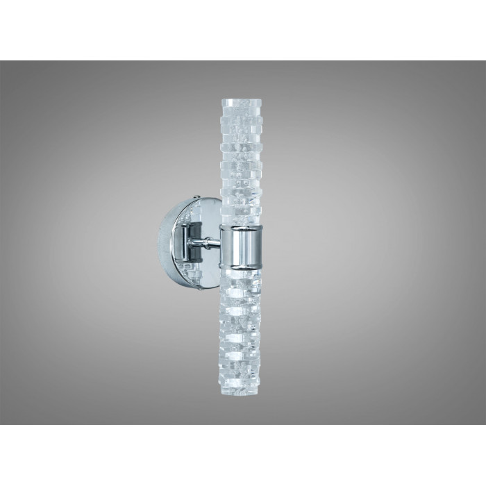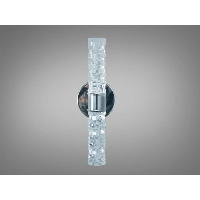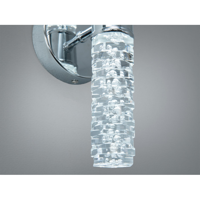 Настінний LED світильник Diasha у хромі потужністю 5 Вт — компактне бра для локального та акцентного освітлення. Прозорий циліндричний плафон зі скла з легким текстурним або «бульбашковим» ефектом створює м’яке розсіяне світло, а кругла металева основа з хромованим покриттям підтримує сучасну естетику мінімалізму.