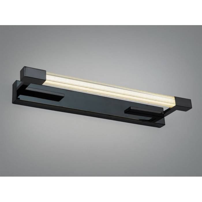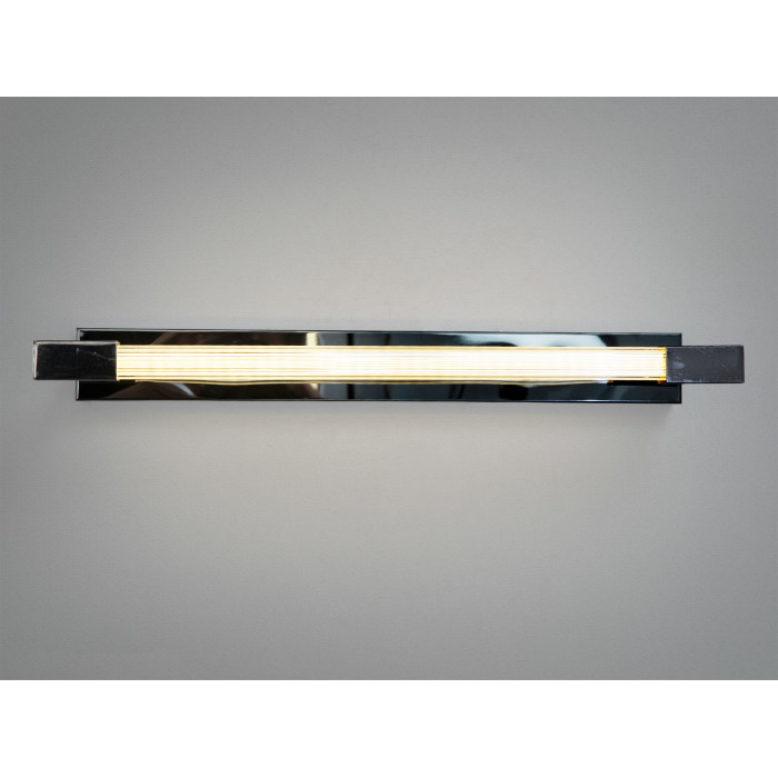 Корпус виконаний з металу в оздобленні чорний хром. Дзеркальна основа візуально підсилює яскравість і створює чистий контур світла вздовж поверхні. Подовжений світлодіодний модуль з мʼяким розсіюванням дає рівномірний безперервний потік, що зазвичай підходить для локального підсвічування зон шириною дзеркала або полотна картини. Завдяки компактній глибині настінне розміщення виглядає охайно навіть у вузьких коридорах.