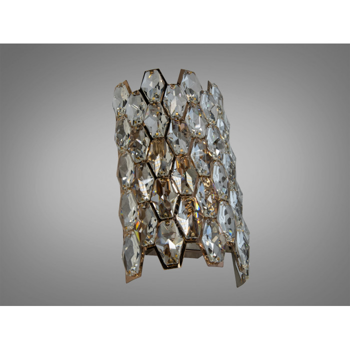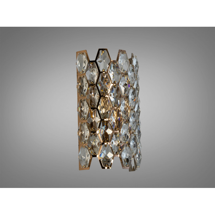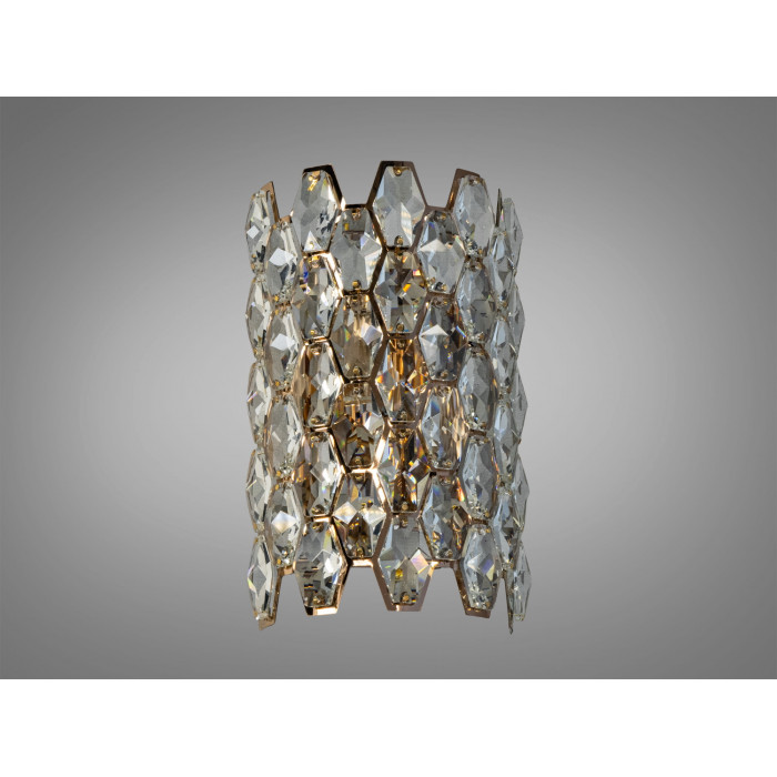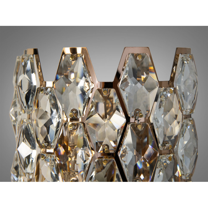 Світильник має циліндричну форму з прозорими кристалами, які підкреслюють його вишуканий дизайн. Золотий колір додає нотки елегантності та розкоші, роблячи його ідеальним вибором для сучасних інтер′єрів. Завдяки багатогранним кристалам, він створює ефект розсіювання світла, роблячи освітлення м′яким та приємним.