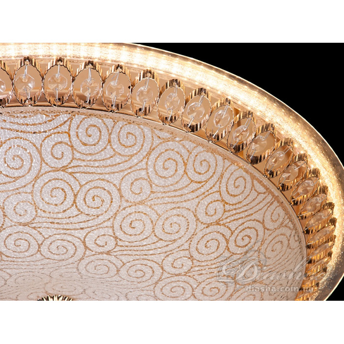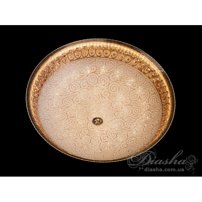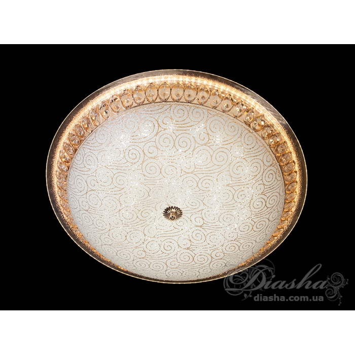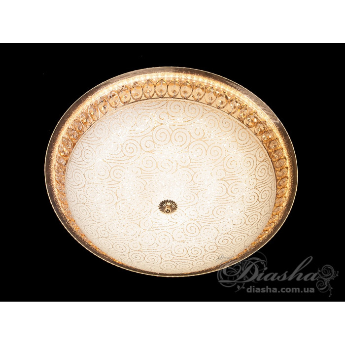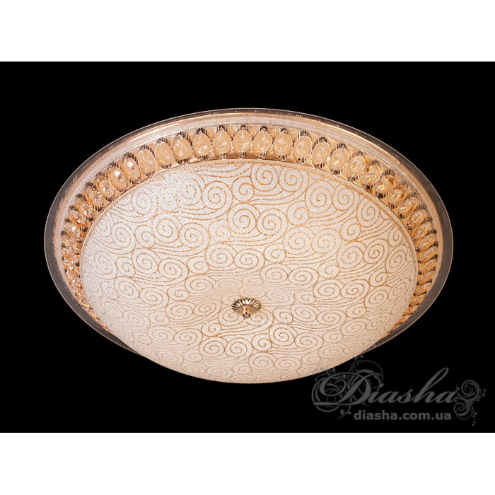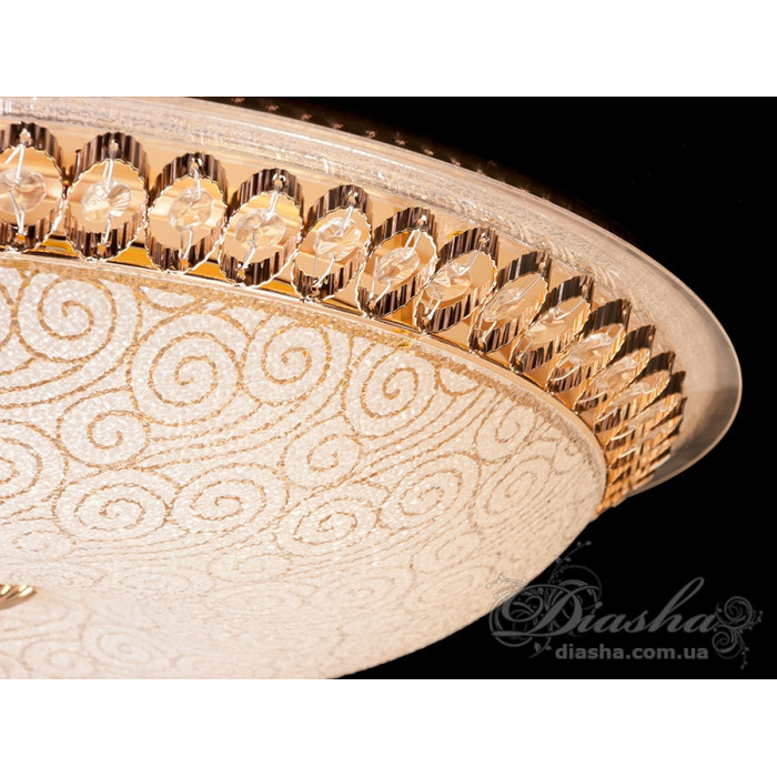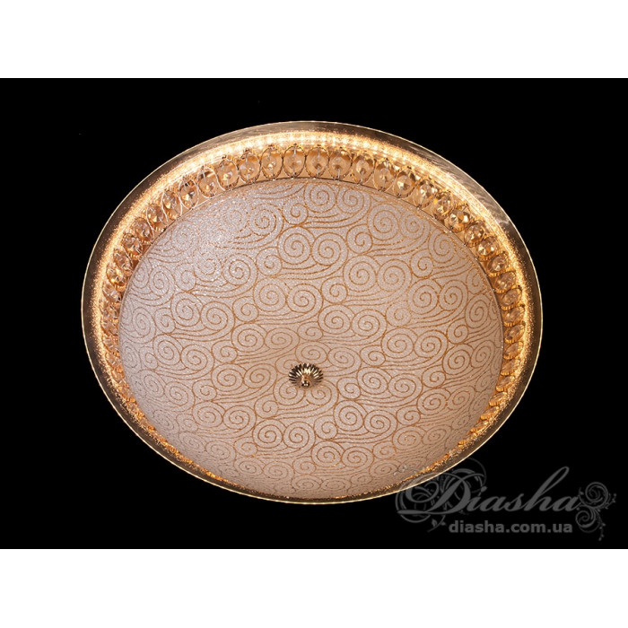 Центральною особливістю дизайну є текстурований акриловий купол, що імітує візерунок сот, забезпечуючи рівномірне розсіяне світло. Він оточений красивою металевою облямівкою з вигравіруваними декоративними елементами, що підсилюють його елегантність. Блискуча поверхня обрамлення підкреслюється кришталевими вставками, які перехоплюють і відбивають світло, створюючи динамічний і привабливий вигляд.