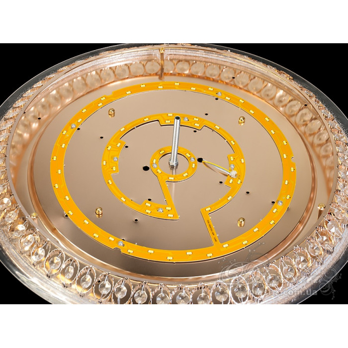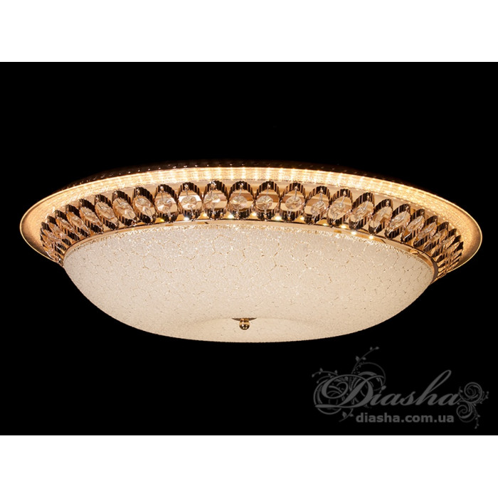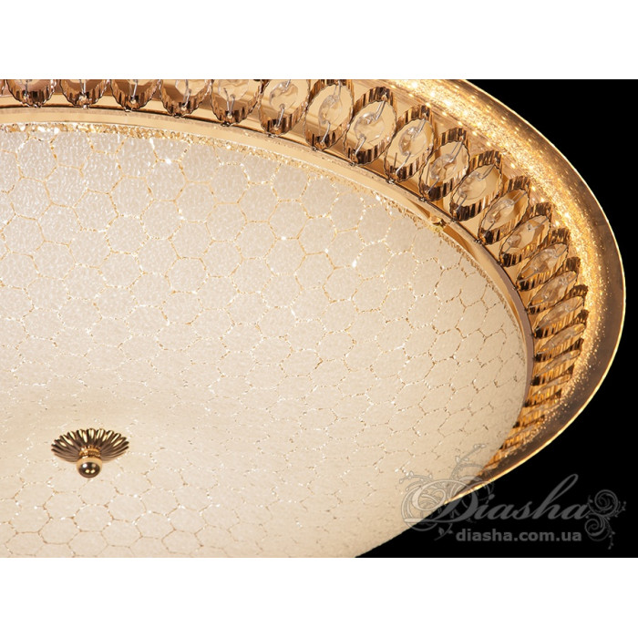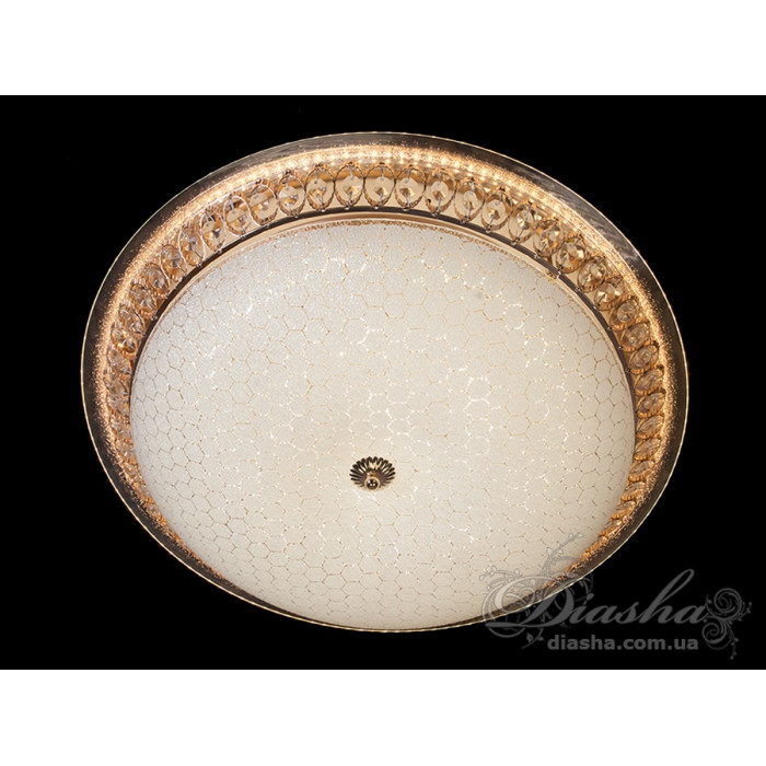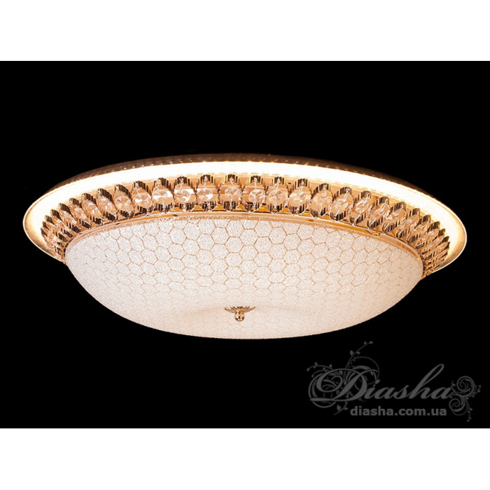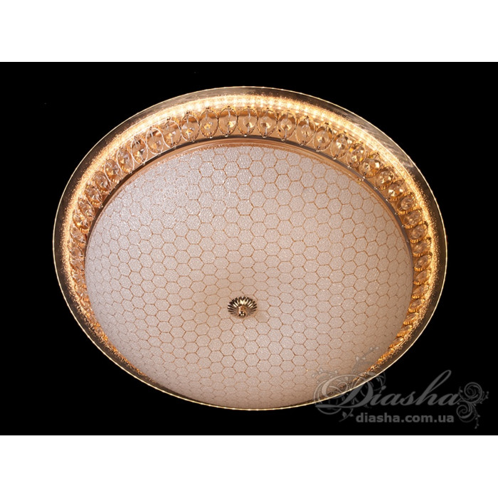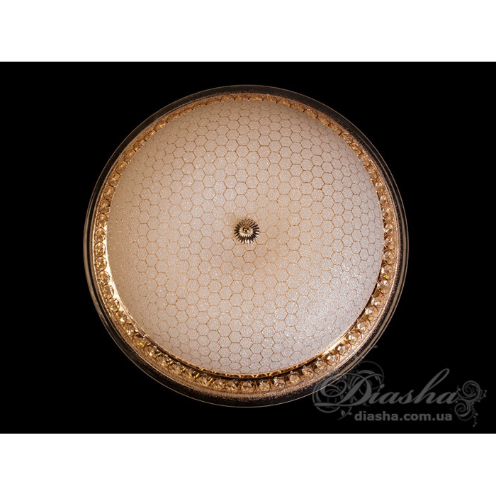Центральною особливістю дизайну є текстурований акриловий купол, що імітує візерунок сот, забезпечуючи рівномірне розсіяне світло. Він оточений красивою металевою облямівкою з вигравіруваними декоративними елементами, що підсилюють його елегантність. Блискуча поверхня обрамлення підкреслюється кришталевими вставками, які перехоплюють і відбивають світло, створюючи динамічний і привабливий вигляд.
