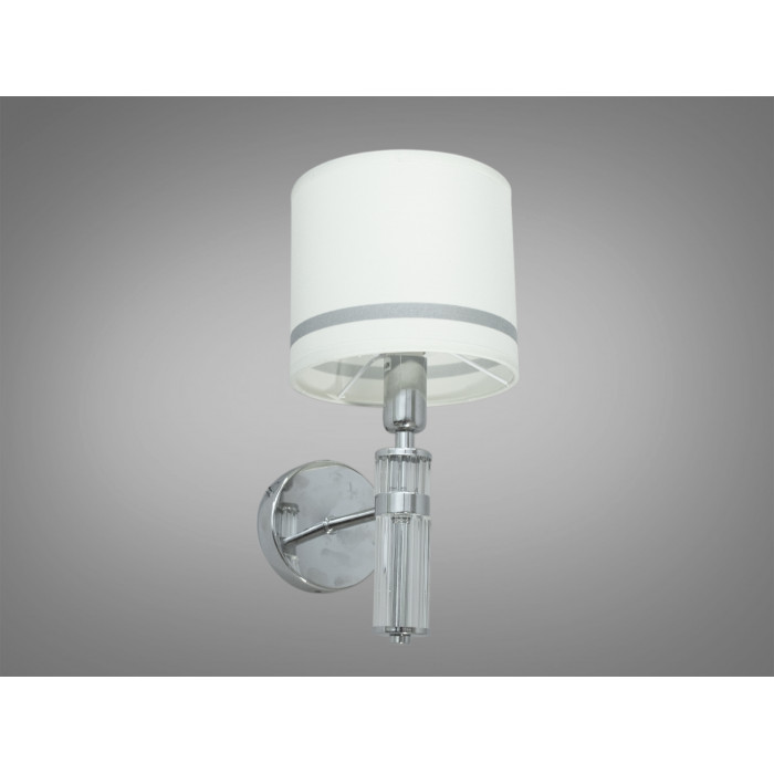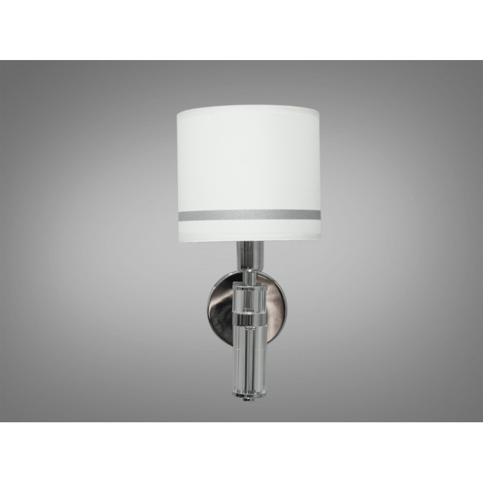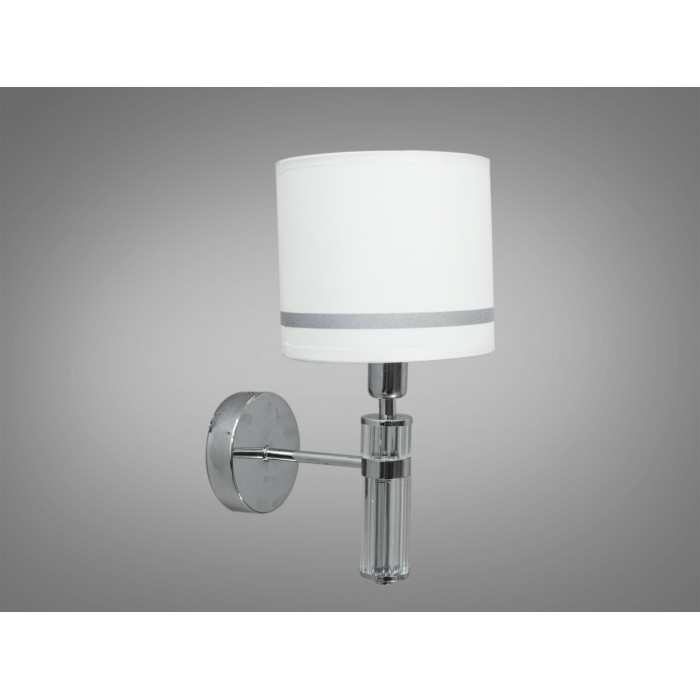 Це класичне бра з абажуром вражає своєю витонченістю та досконалим дизайном. Його основа виконана з хромованого металу, що надає йому дзеркального блиску та сучасного вигляду. Верхня частина світильника прикрашена текстильним абажуром білого кольору з лаконічними декоративними смугами, що підкреслюють його аристократичність. Доповнює загальний стиль прозорий декоративний елемент на корпусі, який додає світильнику вишуканого шарму.