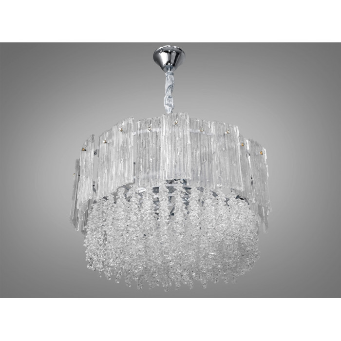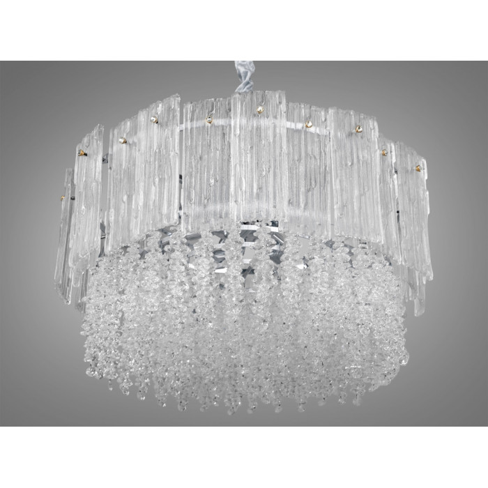 Люстра з фото, Неповторна підвісна люстра зі скляними елементами, яка розрахована на 11 ламп. Це витвір української компанії ТМ "Діаша", і вона виконана у хромованому кольорі, що надає їй сучасного блиску, хоча загальний стиль залишається класичним.