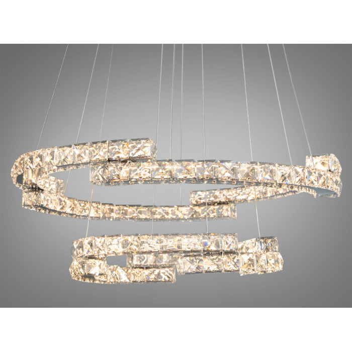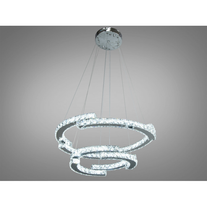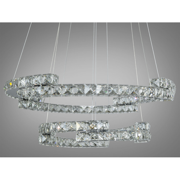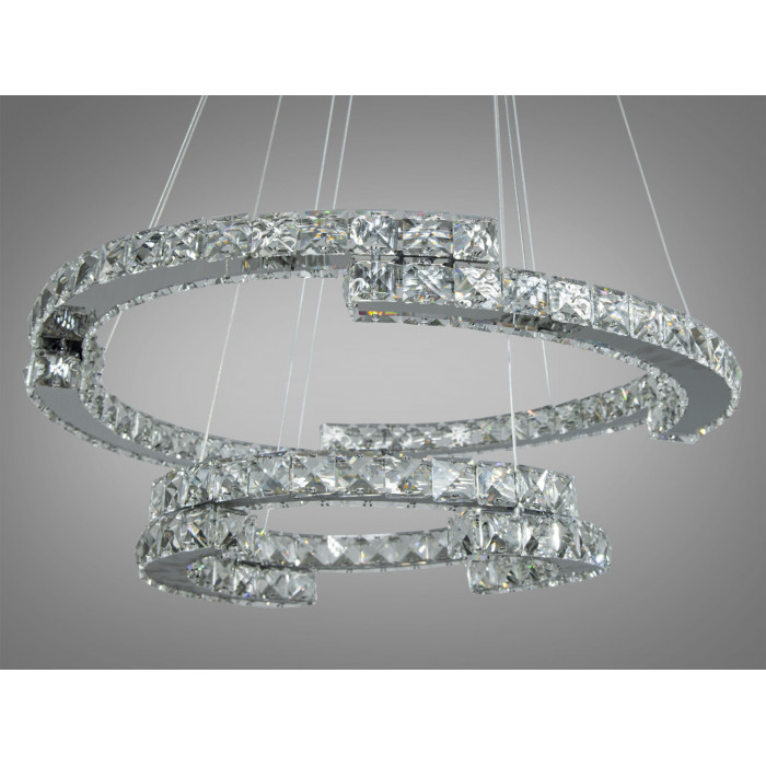 Перед вами неймовірно елегантна, оригінальна кришталева підвісна LED люстра з пультом, яка стане справжньою окрасою будь-якого сучасного інтер'єру. Ця люстра складається з двох унікальних кілець різного діаметру, підвішених паралельно. Кожне кільце, в свою чергу, складається із чотирьох частин. Кільця виконані в розкішному хромованому кольорі, що додає їм стильного та сучасного вигляду.