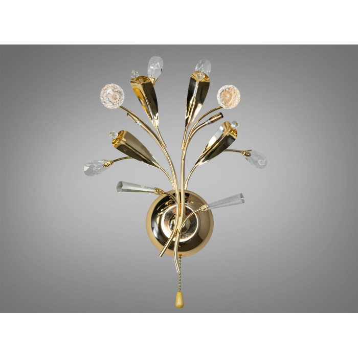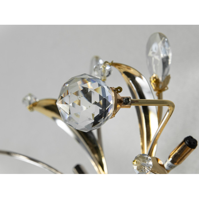 Ця модель бра оживляє стіни, перетворюючи їх у полотно для ніжного букету з квітів, які здаються наче вирощені зі світла. Золотисті стебла граційно вигинаються, тримаючи на собі блискучі кристали, що імітують квіткові бутони та пелюстки. Дизайн з елементами кристалів додає світильнику привабливого блиску та ефекту розсіювання світла, яке створює неповторну атмосферу у просторі.
