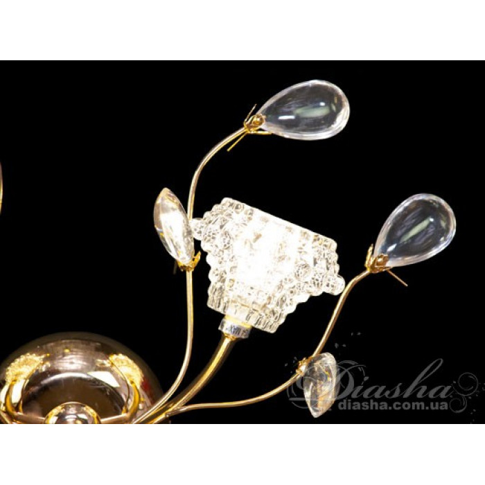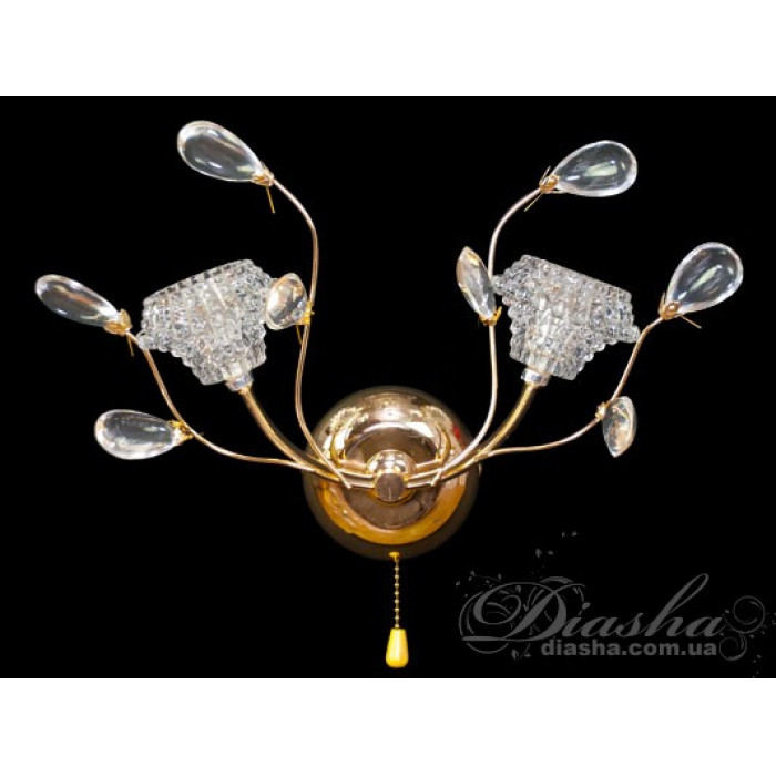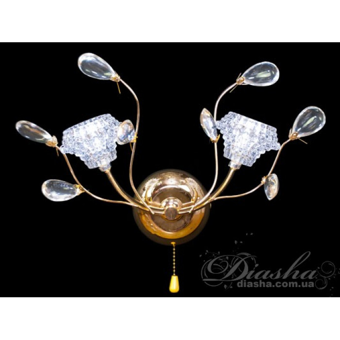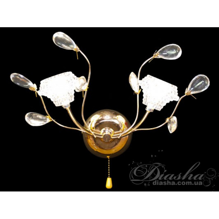 Золотистий корпус бра додає розкоші та тепла дизайну, роблячи його ідеальним для класичних та традиційних просторів. Внизу корпусу розташований декоративний акриловий елемент у формі краплі, який завершує композицію, додаючи витонченості та доповнюючи загальний образ.