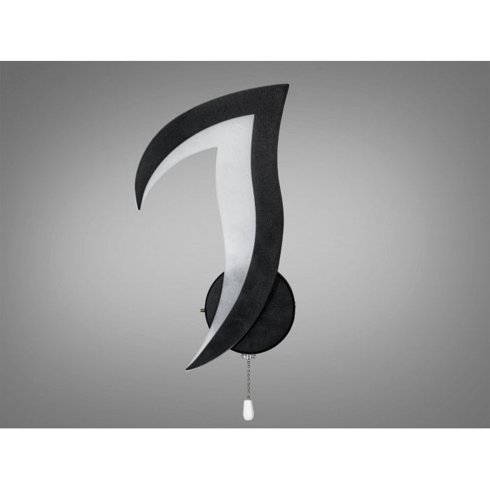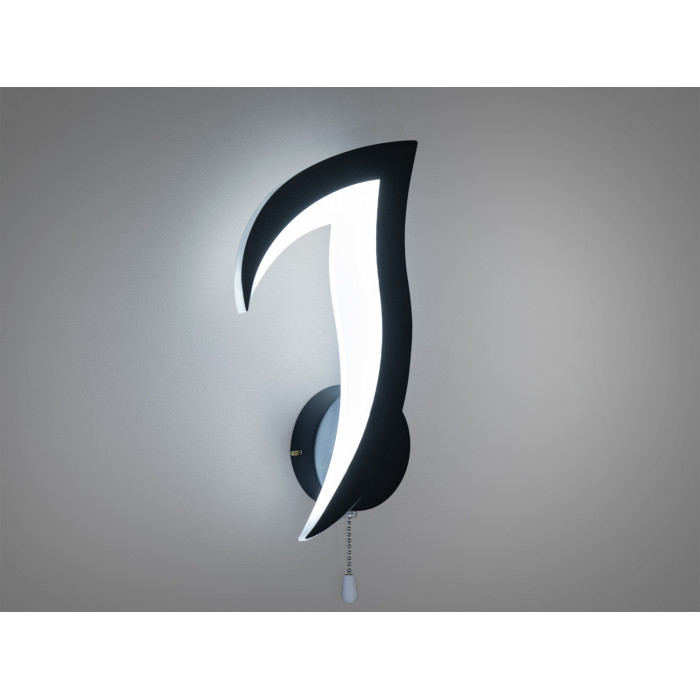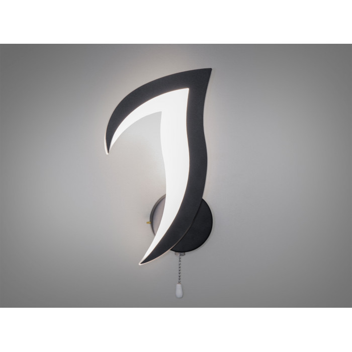 На фото зображено справді оригінальний світлодіодний настінний світильник, виконаний у глибокому чорному кольорі з витонченою динамічною формою, яка одразу привертає увагу. Його силует нагадує вигин пташиного пера або язик вогню, застиглий у русі. Така форма створює відчуття руху й витонченості навіть у нерухомому стані, надаючи інтер’єру особливого характеру. Чорний матовий корпус контрастує з м’яким світлом, яке виходить із внутрішньої частини, підкреслюючи кожен вигин, кожну деталь. Усередині декоративного елементу розміщено акриловий розсіювач, який рівномірно розподіляє світло, надаючи йому об’ємності та м’якості. Завдяки тому, як світло лягає на стіну, здається, що сам світильник світиться зсередини, наче джерело енергії. У нижній частині моделі розташовано ланцюжковий вимикач із краплевидною білою ручкою — цей елемент додає комфорту в керуванні та приємного тактильного відчуття.