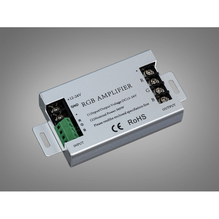 Корпус підсилювача виконаний у мініатюрному форматі, що дозволяє легко інтегрувати його у вже готові проєкти або нові установки. Підтримка робочої напруги 5V, 12V і 24V робить його універсальним інструментом, сумісним з більшістю популярних контролерів на ринку. Пристрій ефективно дублює керуючі сигнали, що надходять від контролера, і передає їх на наступні секції RGB стрічки, зберігаючи чіткість і точність кольорових відтінків.