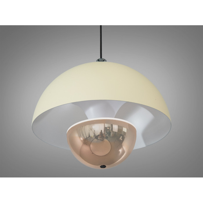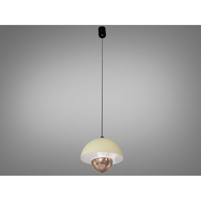 Світильник має гладкий молочно-білий куполоподібний абажур і дзеркальну сферу під золото у центрі. Така комбінація формує м’яке, розсіяне світло з помірним відблиском, що візуально поглиблює світлову пляму. Прозорий елемент у центрі працює як додатковий дифузор, розподіляючи потік і зменшуючи жорсткі тіні. Довгий чорний шнур полегшує монтаж у приміщеннях з високими стелями або над робочими поверхнями.