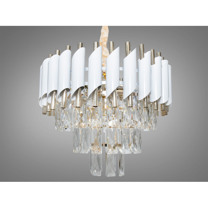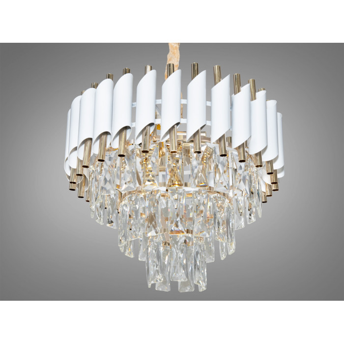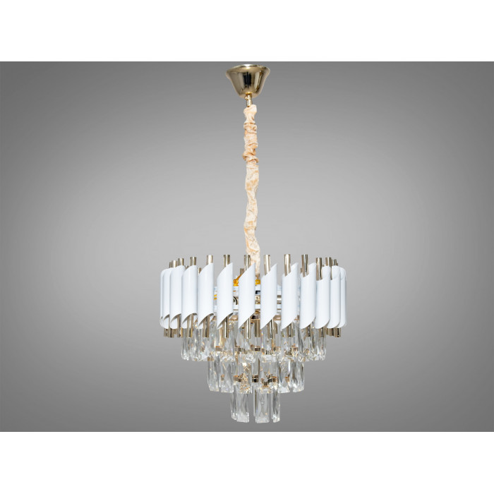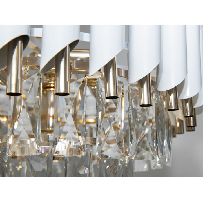 Каркас — метал, пофарбований у білий та золотистий кольори. Кришталеві підвіски зберігають прозорість і блиск за умови базового догляду: періодично знімати пил сухою або трохи зволоженою серветкою без абразивів. Поєднання металу і кришталю припускає стабільну геометрію, акуратну посадку елементів і візуальну чіткість силуету.