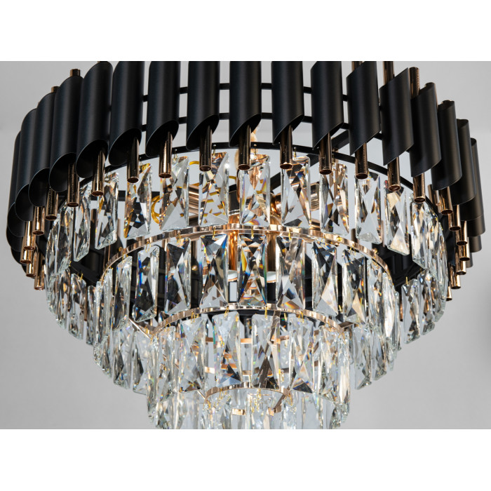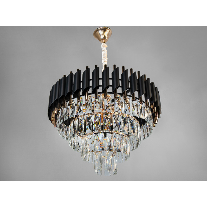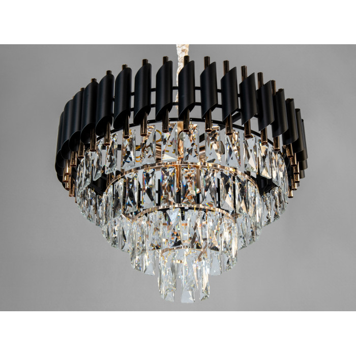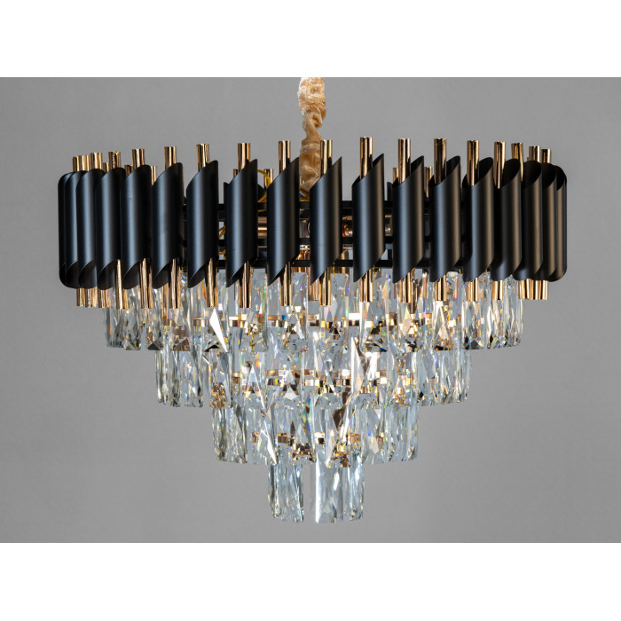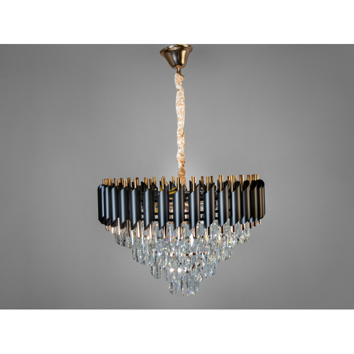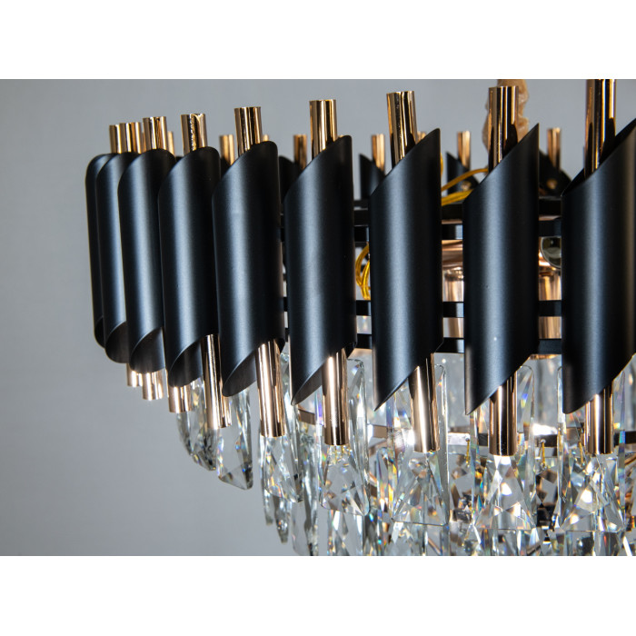 Підвісна кришталева люстра у кольорі чорний+золото поєднує стриманий металевий каркас із виразним каскадом кришталевих підвісок. Конструкція огорнута дугою з трубок, наче флейта Пана: верхні скошені елементи чорного кольору контрастують із внутрішніми золотистими трубками, підкреслюючи глибину і ритм форми. Сім патронів E14 створюють рівномірне розсіювання, яке за умови добору відповідних ламп може бути достатнім для освітлення простору площею близько 15 м².