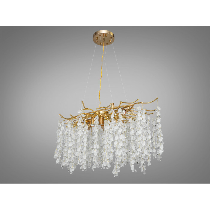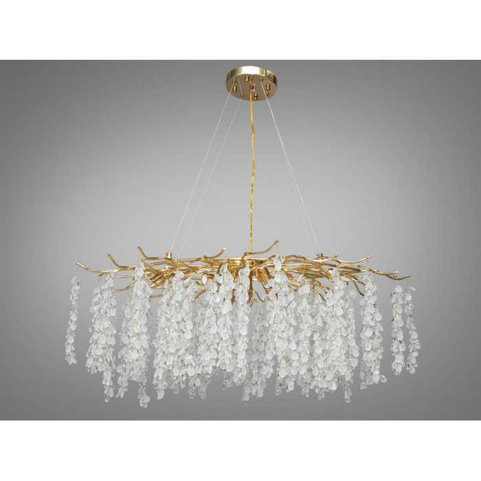 Підвісна кришталева люстра Гліцинія 603-L900GD у золотому виконанні створює виразний каскад світла завдяки підвіскам з прозорих і матових кристалів, що нагадують краплі дощу. Витягнута форма забезпечує лінійний світловий акцент над довгим обіднім столом, у вітальні або холі. Лампи не входять у комплект, передбачено 10 патронів E14, що дає змогу обрати бажану яскравість і колірну температуру під інтер’єр.