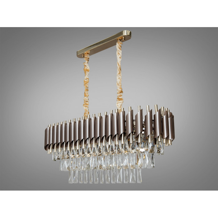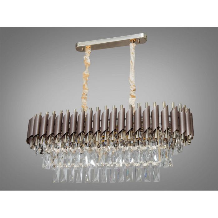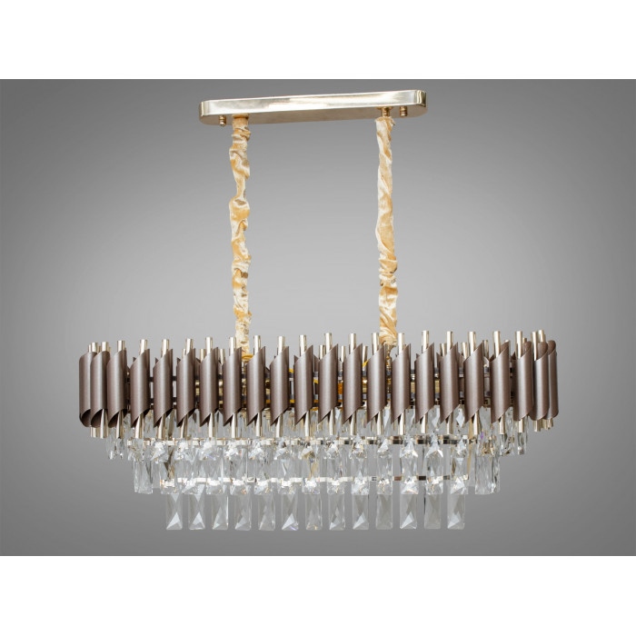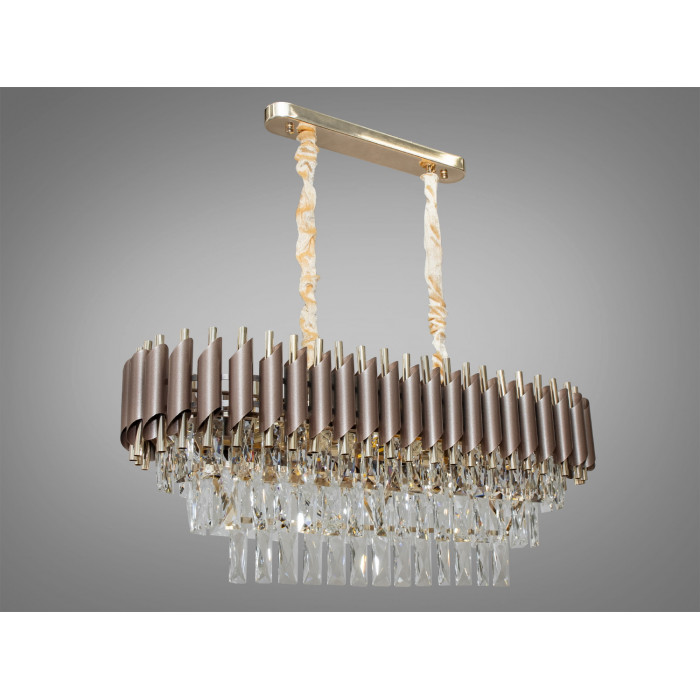 Ця підвісна кришталева люстра овальної форми поєднує теплий коричневий та благородний золотий відтінки, формуючи виразний акцент для інтер’єрів, де потрібне м’яке, але помітне світло. Конструкція розрахована на 8 ламп з цоколем E14, завдяки чому освітлення може бути налаштоване під задачі кімнати — від затишного вечірнього світла до яскравого сценарію для прийому гостей. Рекомендована площа освітлення — до близько 17 м², залежно від типу ламп. Висота підвісу регулюється, керування — від настінного вимикача. Лампочки в комплект не входять.