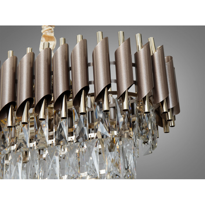 Люстра огорнута дугою з металевих трубок, що нагадують флейту Пана: верхній ярус виконаний зі скошених коричневих трубок, які контрастують з внутрішніми золотистими. Таке поєднання створює глибину та підкреслює овальний силует. Кришталеві підвіски збирають і розсіюють проміння, формуючи м’які відблиски на поверхнях. Завдяки такій композиції модель може пасувати до класики, сучасної класики та контемпорарі з теплими металами.