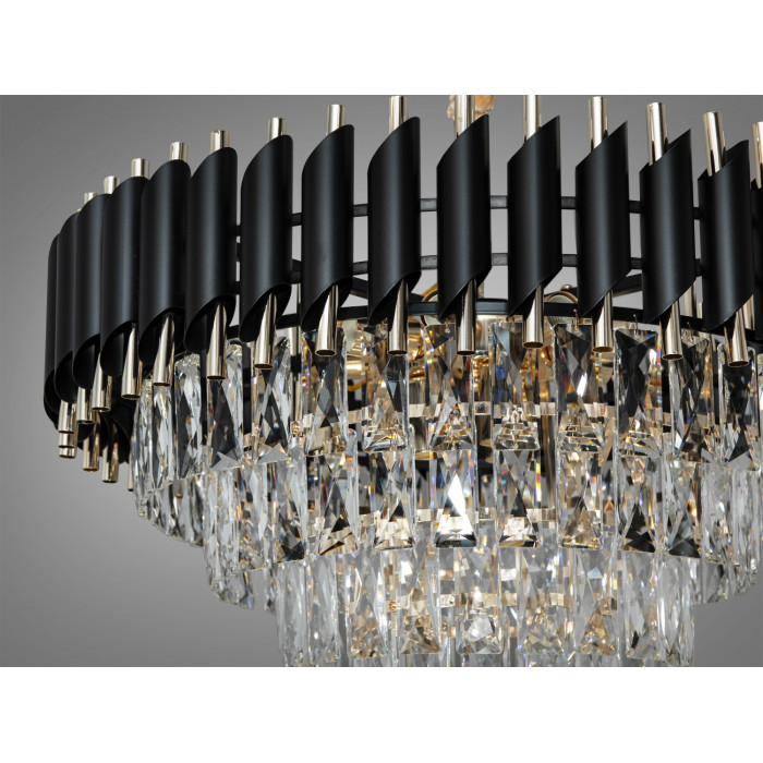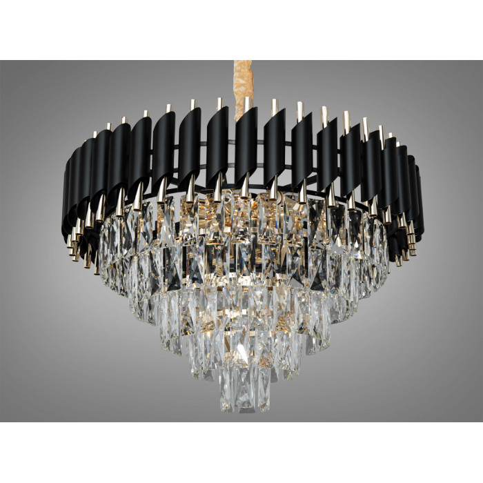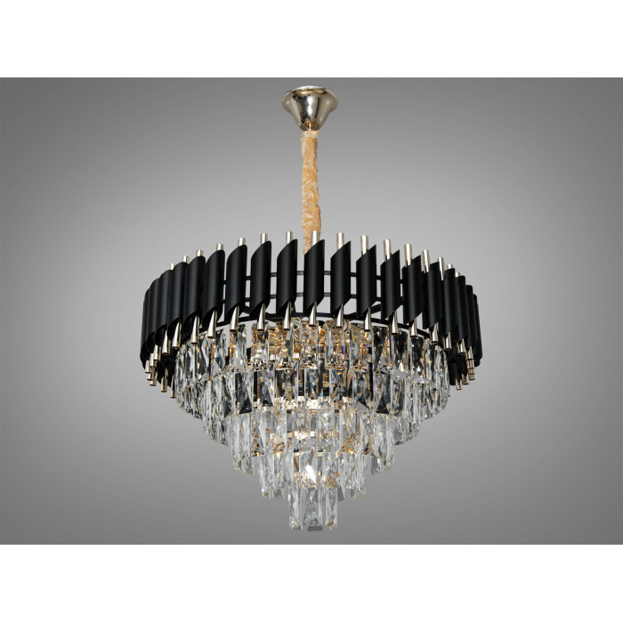 Підвісна кришталева люстра у виконанні чорний + золото з артикулом 9001-600BK+SGD створює виразний акцент у вітальні, залі чи холі. Модель побудована навколо круглої основи з металевих трубок, що формують об′ємний каскад. Багатогранні кришталеві елементи підхоплюють і розсіюють світло, надаючи м′яке сяйво та глибину простору. Завдяки 11 лампам з цоколем E14 освітлення розподіляється рівномірно по периметру, а характерний контраст чорних і золотистих деталей підкреслює сучасний характер люстри з відсиланням до класики.