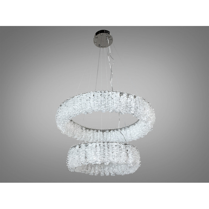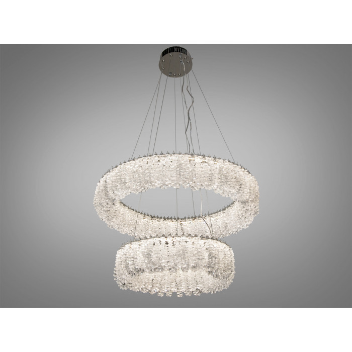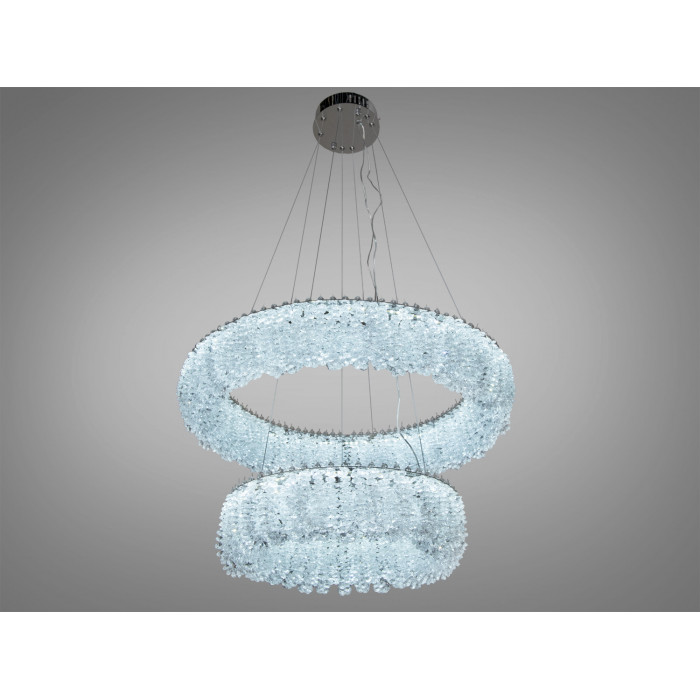 Люстра має вишукану архітектуру з двома кільцями, прикрашеними прозорими кристалами, що відбивають і розсіюють світло. Хромовані елементи додають сучасного блиску, контрастуючи з прозорістю кришталю.