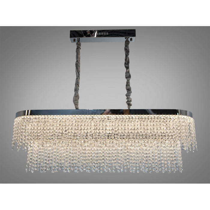 Ця кришталева люстра на тросах, як розкішний водоспад світла, струменить золотистим сяйвом, яке відбивається від безлічі витончених кришталів. Вона втілює у собі саму суть розкоші та елегантності, яка змушує зупинитись та милуватись її кожним мерехтливим рухом.
