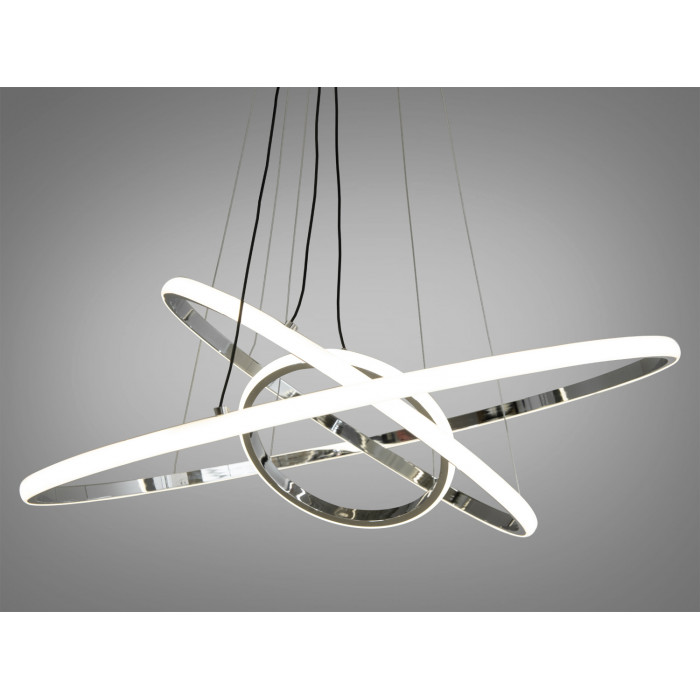 Люстри сучасні новинки 2024. Підвісна лед люстра в кухню з диммером потужністю 90 ват. Вона складається з декількох елегантно переплетених кілець, виконаних з алюмінію з силіконовим розсіювачем, які створюють витончену і динамічну композицію. Переплетення кілець нагадує мотиви робіт Василя Кандинського, де плавність ліній і геометричні форми гармонійно співіснують, створюючи майже мистецьку атмосферу.
