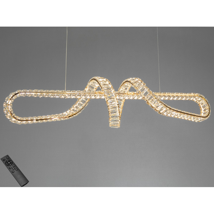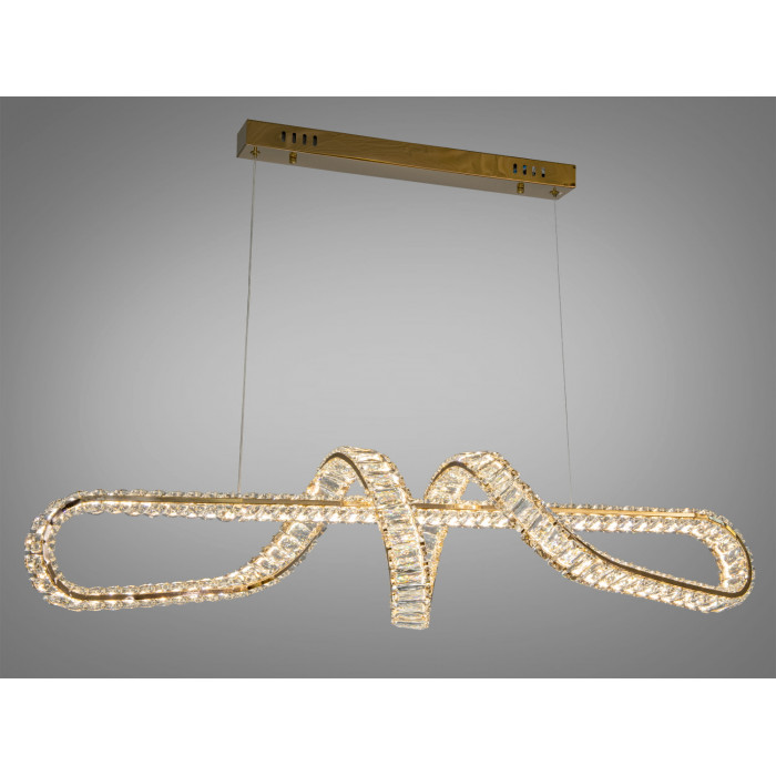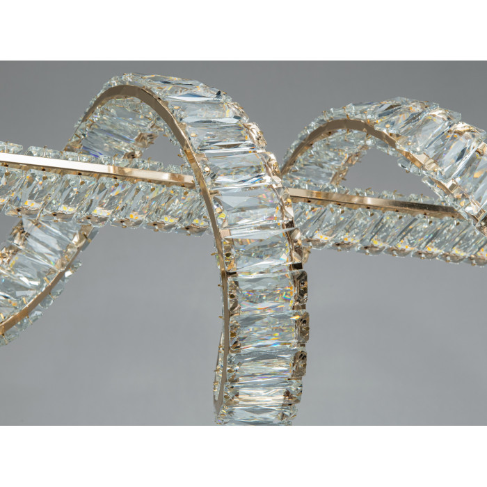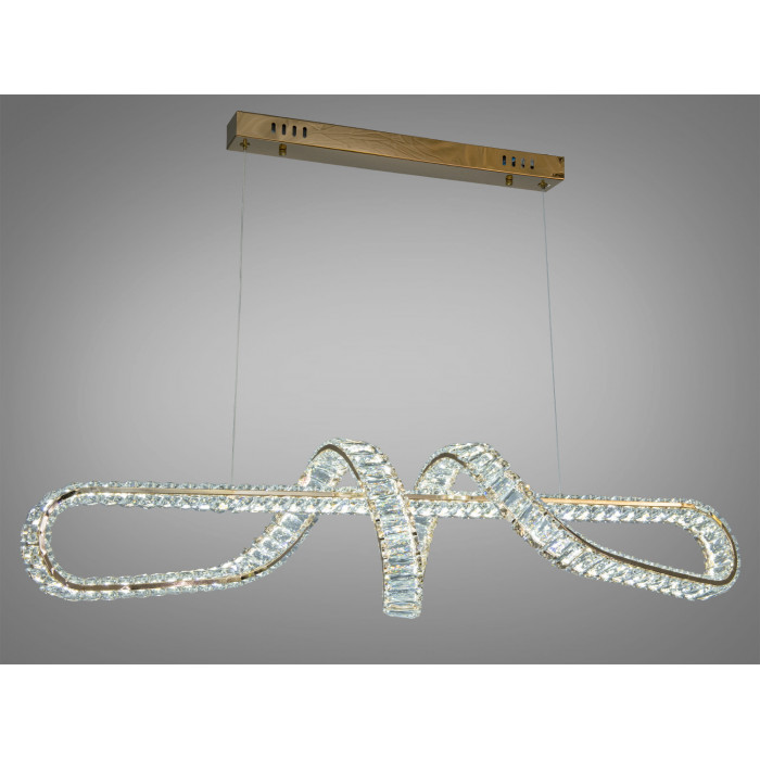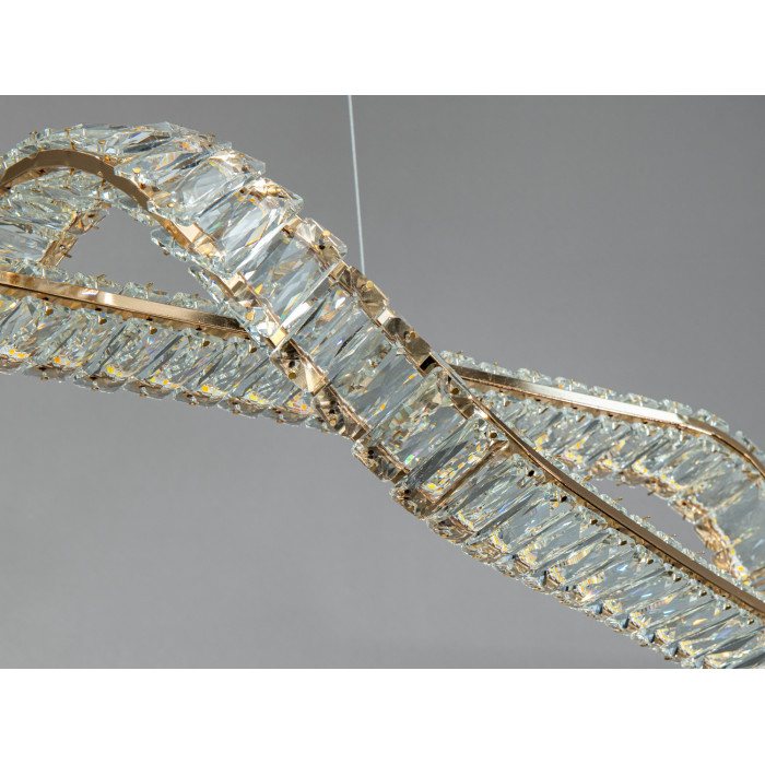 Головний візуальний акцент — плавний «завиток»/петля, який підвішується до стелі та утворює багатошарові відблиски на кристалах. Золоте покриття гармонійно поєднується з прозорими гранованими елементами, а підвісна конструкція робить світильник помітним, але не перевантажує простір. Такий формат пасує до мінімалістичних, modern, contemporary та модерн-класичних рішень.