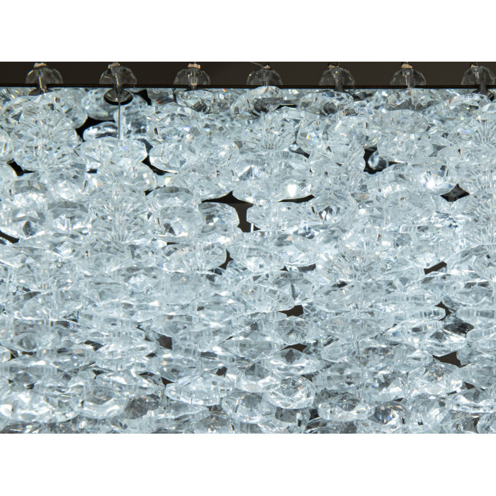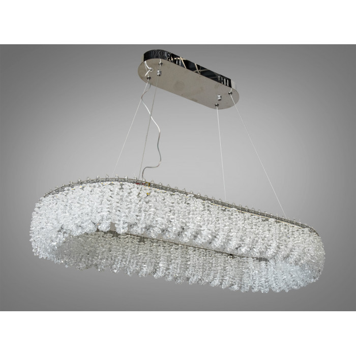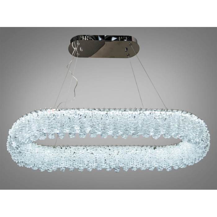 Люстра виготовлена з високоякісного хрому та прозорого кришталю, що створює ефект блиску, підкреслюючи сучасний стиль. Дві кільцеві конструкції прикрашені кришталевими підвісками, що віддзеркалюють світло й розсіюють його по всій кімнаті.