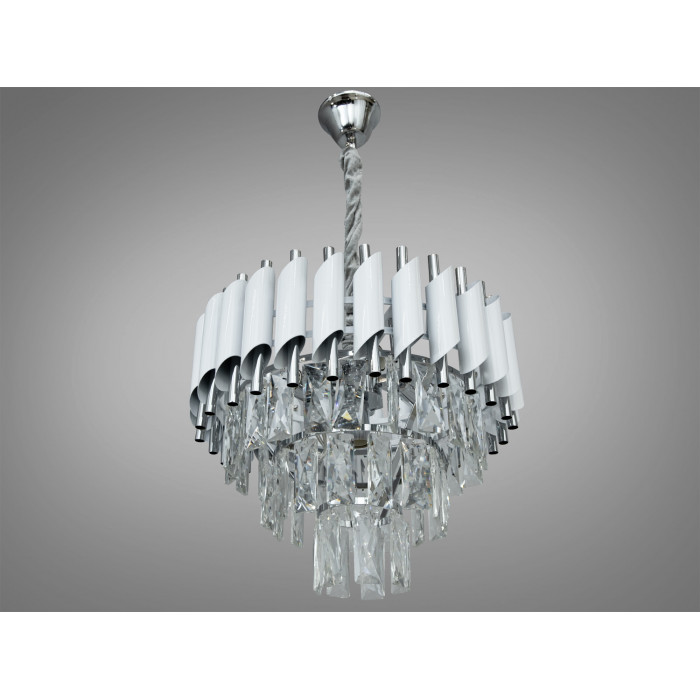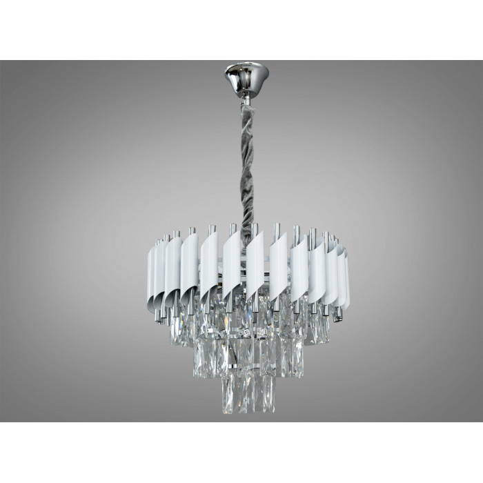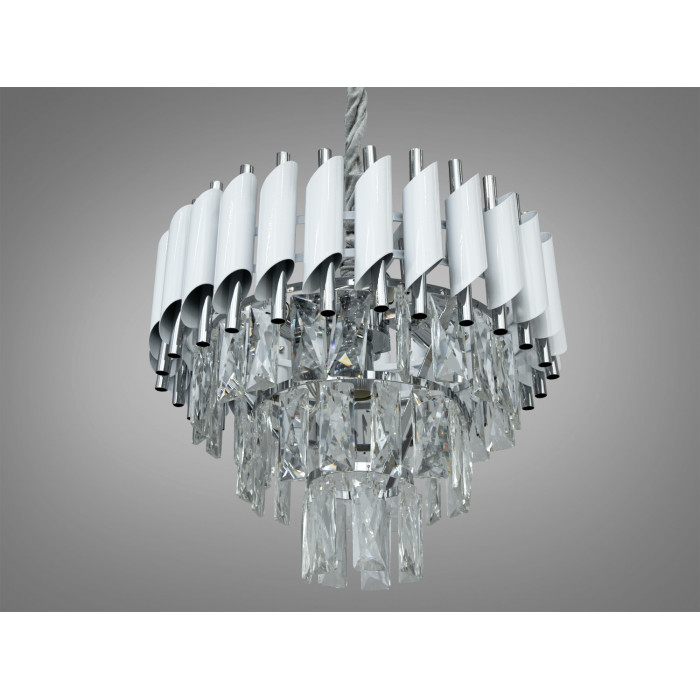 Підвісна люстра у виконанні білий + хром поєднує металевий каркас і кришталеві елементи. Конструкція огорнута дугою з трубок, що нагадує флейту Пана: верхні скошені трубки білого кольору утворюють контур, а внутрішні трубки кольору хром забезпечують виразний блиск. П’ять патронів E14 дозволяють сформувати рівномірне розсіяне освітлення; за умови вибору відповідної потужності ламп це зазвичай підходить для приміщення близько 8–10 м².