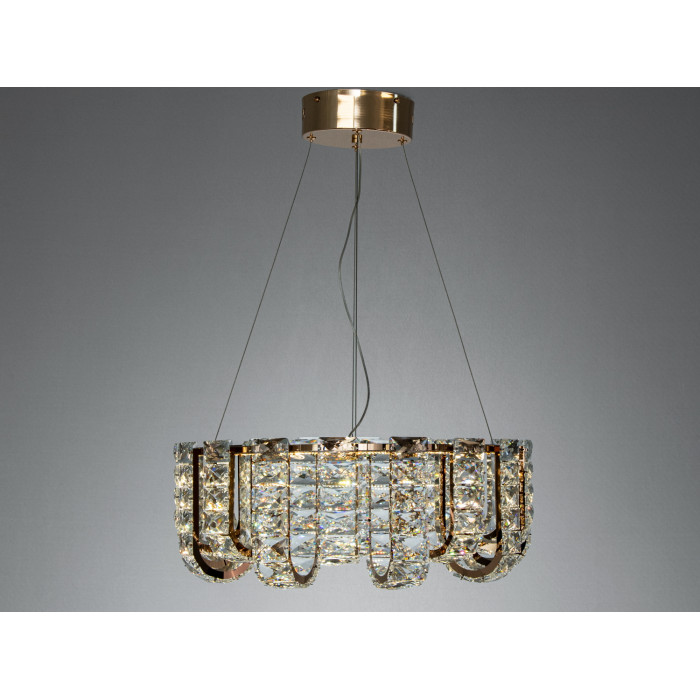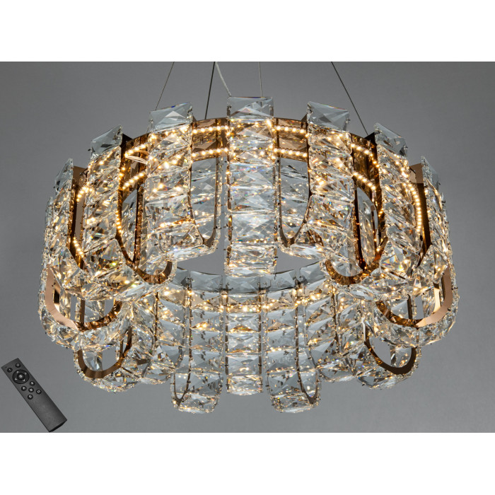 Світлодіодна підвісна кришталева люстра кругла, 70 Вт, золото, з пультом — рішення для кімнат до 12 м², де важливі кероване освітлення та декоративний акцент. Корпус круглої форми тримається на тросах у трьох точках, а багатошарові кришталеві елементи створюють спіральний світловий візерунок. Пульт дистанційного керування дозволяє регулювати яскравість, щоб швидко переходити від м’якого підсвічування до робочого рівня освітленості.