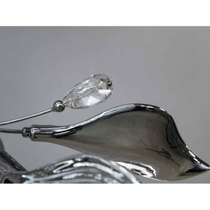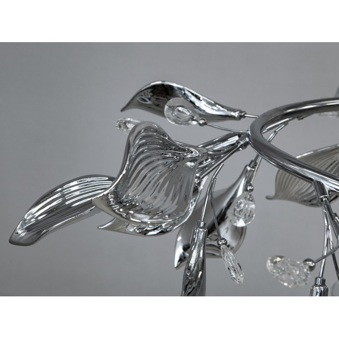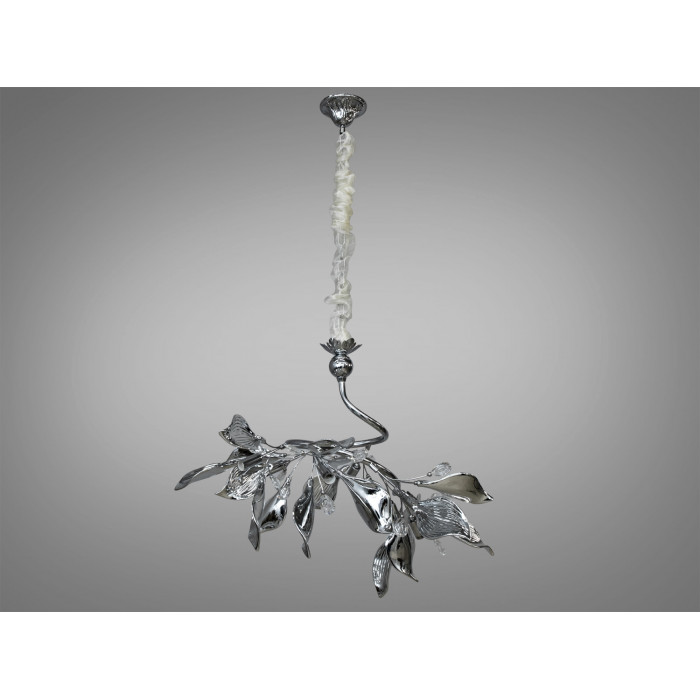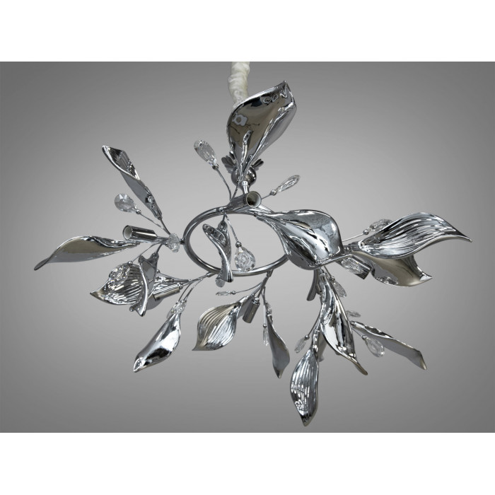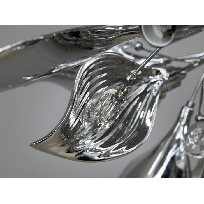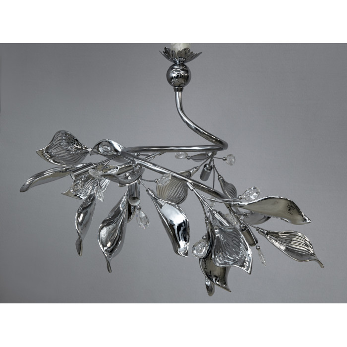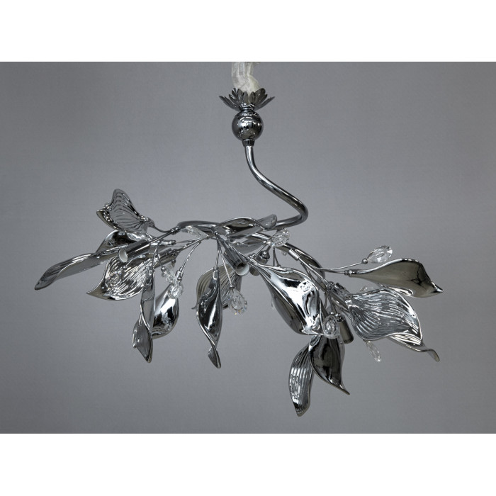 Керамічна люстра для сучасного стилю виглядає елегантно завдяки блискучому хромованому каркасу й деталям із природними мотивами.