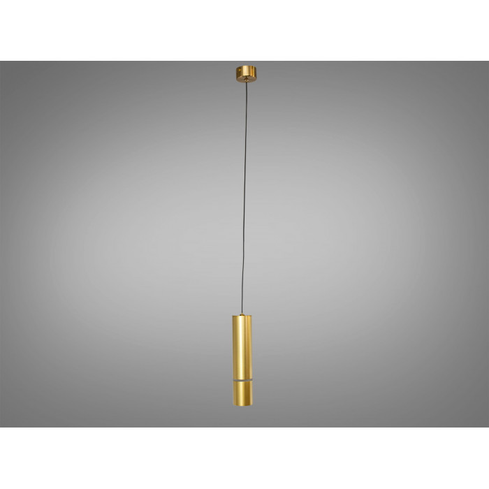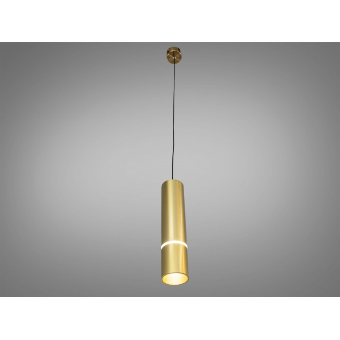 Візуальний акцент формує матовий чорний метал у поєднанні з золотою лінією, що створює легкий контраст без перевантаження простору. Підвіс іде на довгому шнурі, тому його зазвичай можна відрегулювати під час монтажу на потрібну висоту. Спрямована геометрія плафона фокусує світло вниз, що підходить для локального та акцентного освітлення. Така конструкція часто використовується як джерело направленого світла у сучасних інтер’єрах і в комерційних просторах.