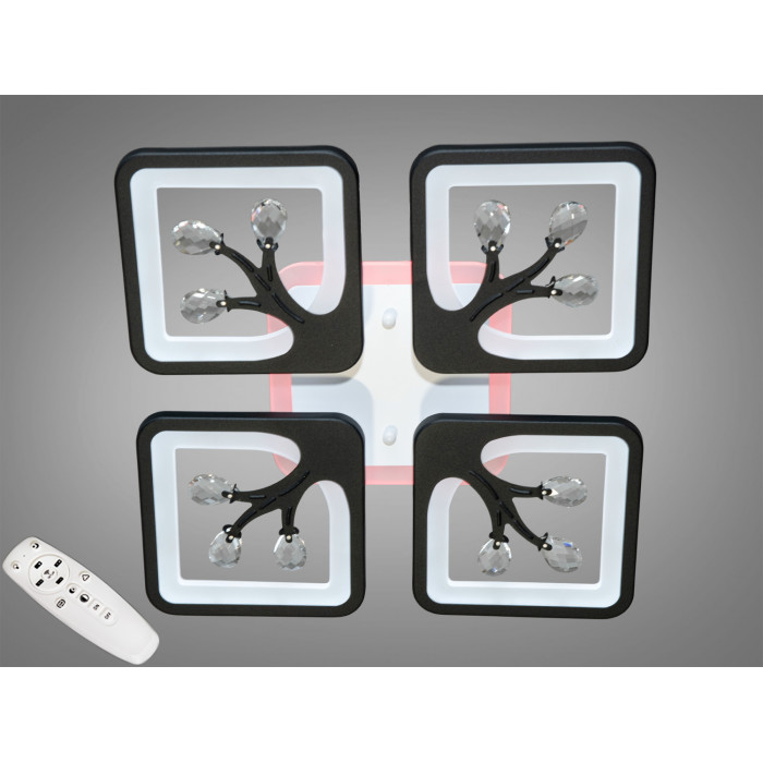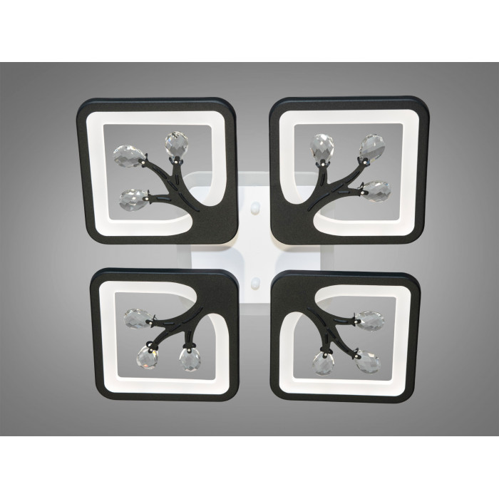 Наша унікальна світлодіодна люстра, яка має чотири квадратних елементи, організовані навколо центральної точки, що створює враження симетричної композиції. Кожен квадрат має внутрішній світлодіодний контур, що надає конструкції візуальної легкості та сучасної естетики. Всередині рамок led люстри розташовані гілки з кришталевими кульками на кінцях, які відбивають світло, створюючи гру світла та тіні, нагадуючи зірки на нічному небі.