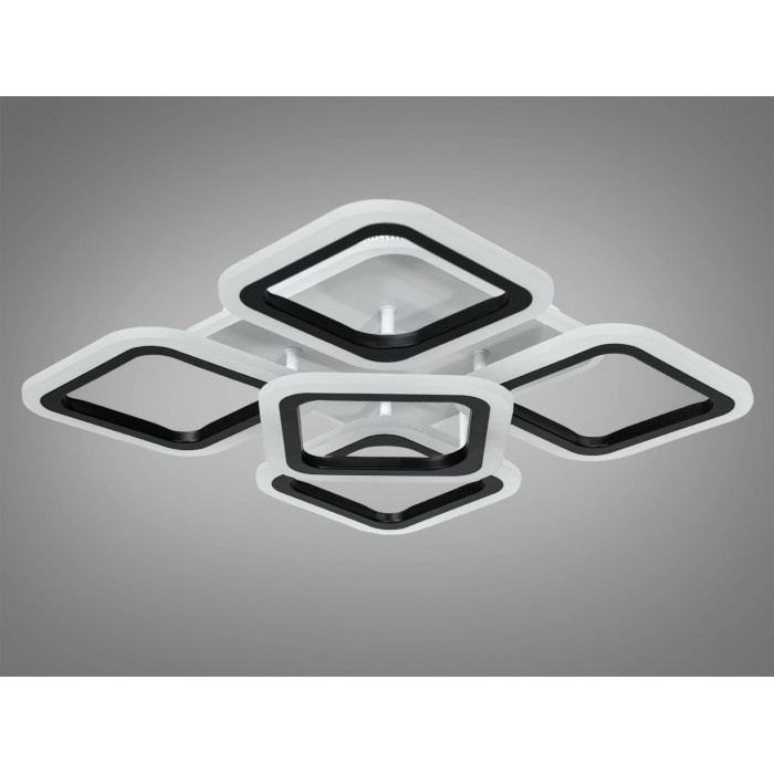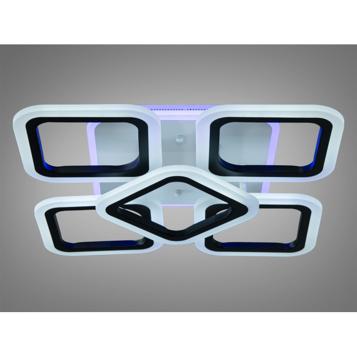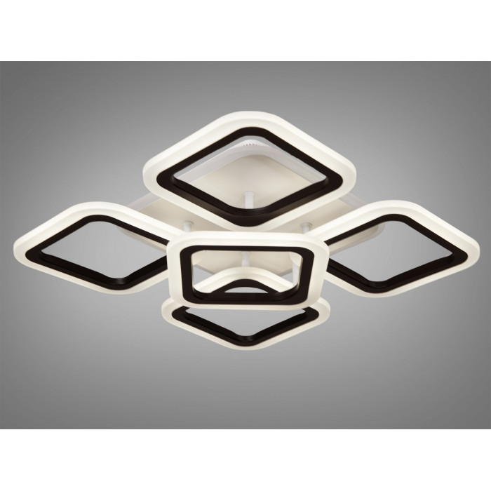 П’ять плафонів люстри виконані у формі квадратів із заокругленими кутами, що надає їй сучасного та геометричного вигляду. Колір плафонів – чорний, що створює контраст із білою основою акриловою основою розсіювачів та підсвіткою, підкреслюючи її стильний дизайн. Кожен плафон має інтегровані LED елементи, які забезпечують яскраве та рівномірне освітлення.