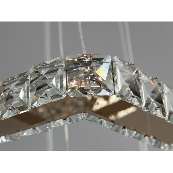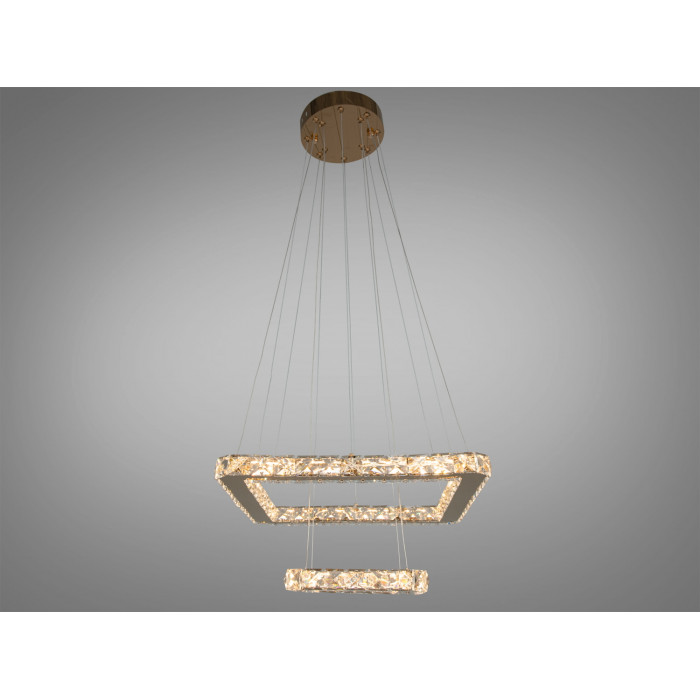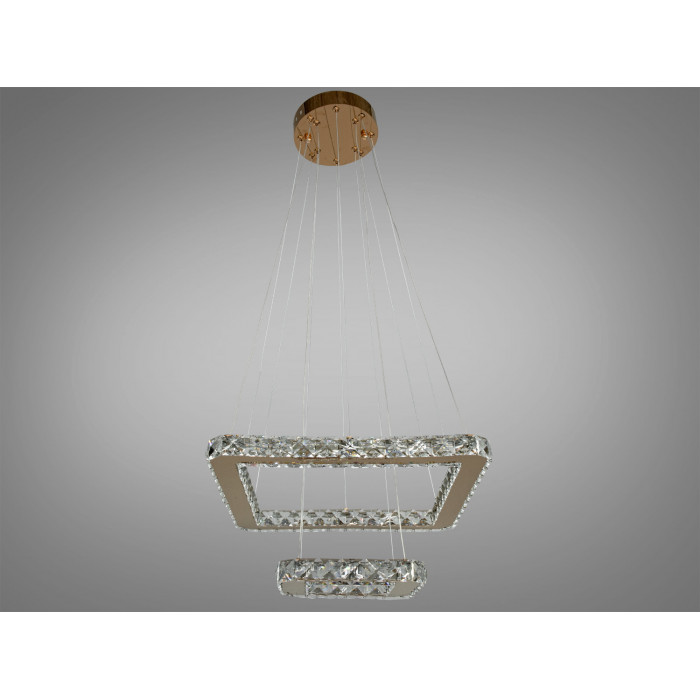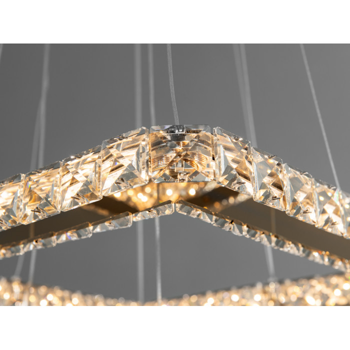 Приваблива кришталева світлодіодна підвісна люстра потужністю 35 Вт з золотими акцентами є справжнім витвором сучасного освітлювального мистецтва. Дизайн цієї люстри включає дві великі квадратні рамки, розташовані одна над одною, що надає їй багатовимірного та динамічного вигляду.