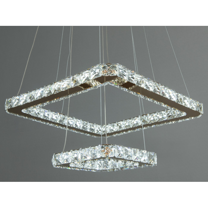 Кришталеві елементи, які обрамляють кожну рамку, блищать і переливаються у світлі світлодіодів, створюючи вражаючий ефект, немов дорогоцінні камені. Вони відбивають світло, наповнюючи простір блиском і розкішшю. Люстра кріпиться до стелі за допомогою тонких тросів, які створюють відчуття легкості та повітряності, ніби люстра плаває у повітрі.