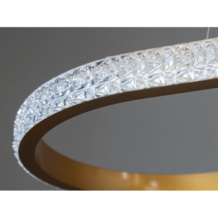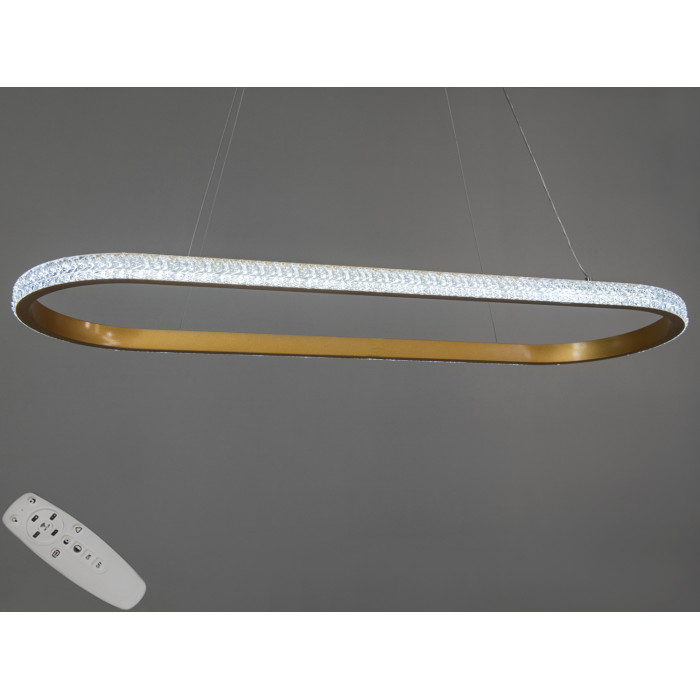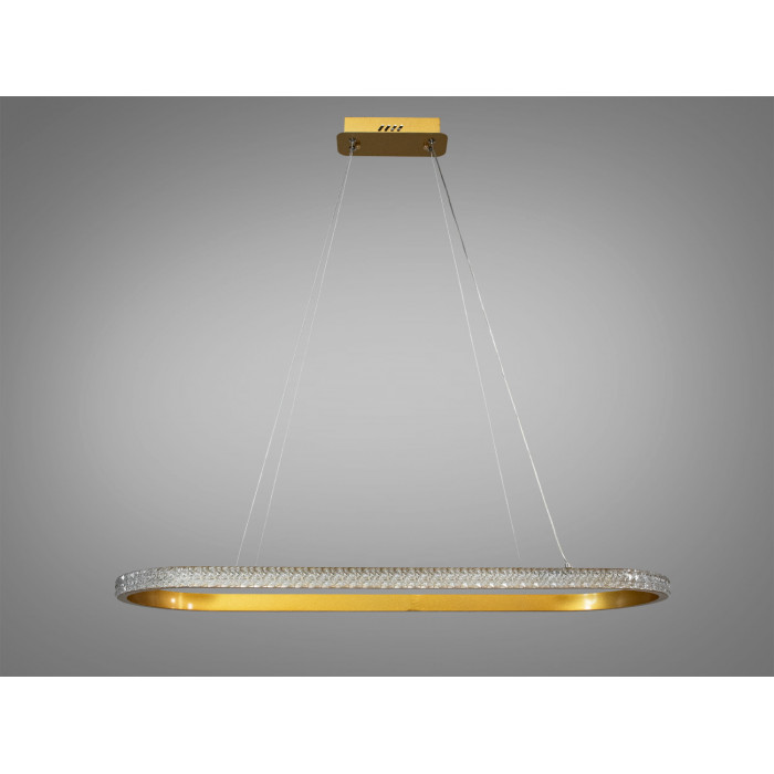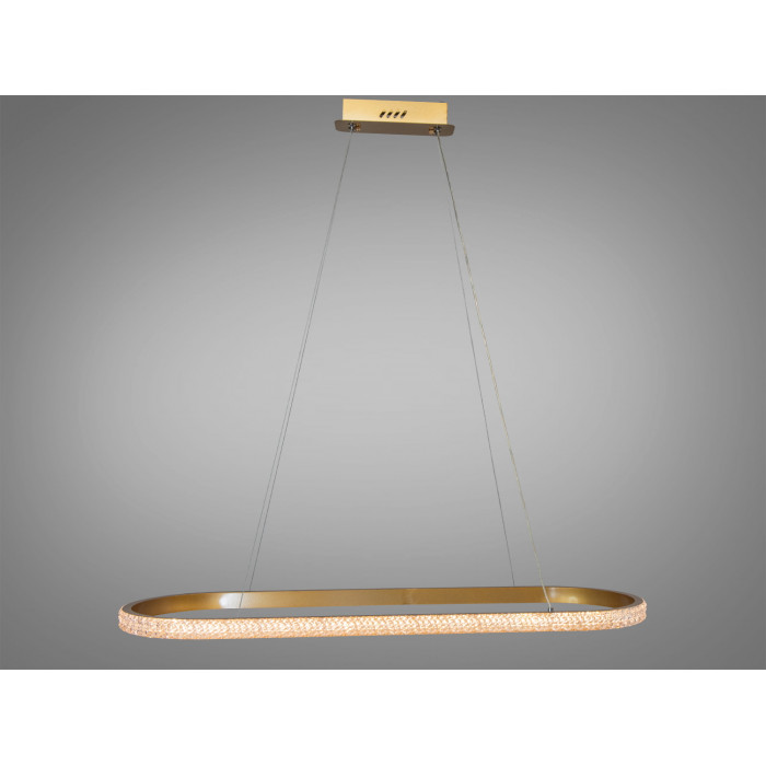 Розкіш та сучасний стиль втілилися у цій підвісній світлодіодній люстрі від ТМ "Діаша". Її унікальна овальна форма додає інтер’єру особливого шарму, а витончене поєднання золотого каркасу та сяючих акрилових розсіювачів створює ефект розсіяного світла, що рівномірно заповнює весь простір. Вона виглядає вишукано та невагомо завдяки тонким підвісам, які надають конструкції легкості. Завдяки мінімалістичному, але водночас розкішному дизайну, ця LED люстра для вітальні стане центральним акцентом у вашому інтер’єрі. Її виблискуючий рифлений акриловий дифузор створює ефект кришталевих відблисків, що надає світлу глибини та м’якості.