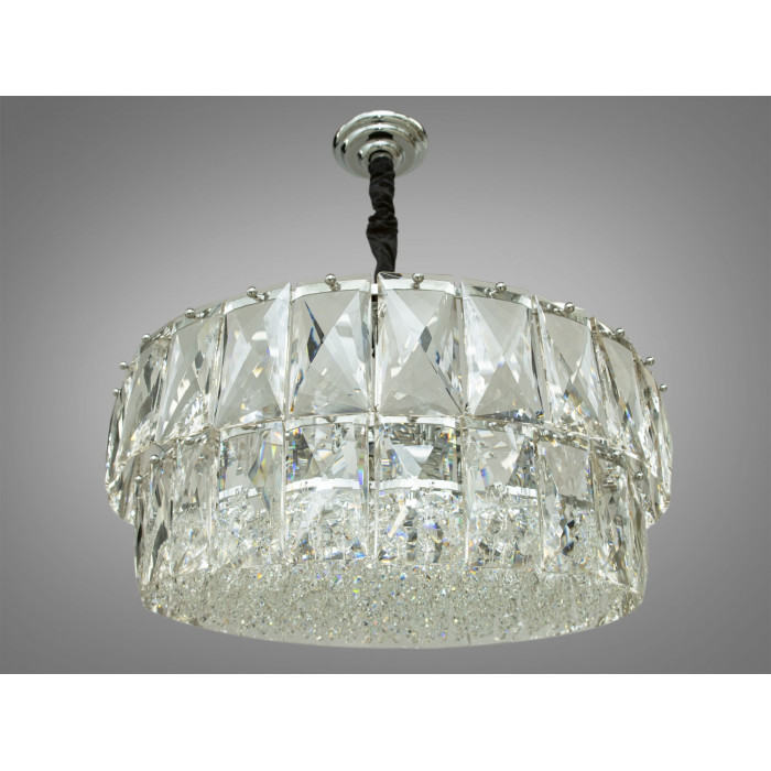 Основою сучасної кришталевої люстри є міцна і легка металева конструкція, яка виступає як естетична рама для кришталевих елементів. Вона має круглу форму, яка додає сучасність та елегантність. Кришталі огранені в різноманітних стилях, таких як кришталеві краплі, бічні прямокутні матовані призми.