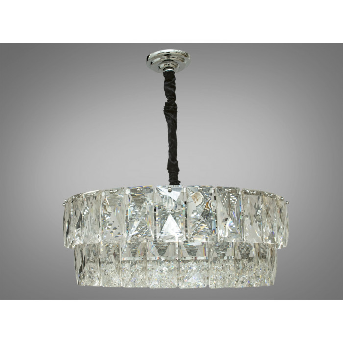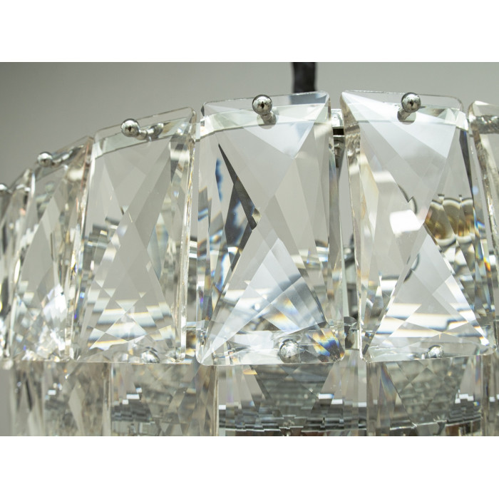 Основна особливість цієї люстри - це комбінація великих прямокутних огранених матованих кришталів, які розташовані по краях люстри. Їхні матовані прозорі поверхні створюють ефект сучасності та розкоші, а матованість забезпечує ніжний розсіюючий світловий ефект.