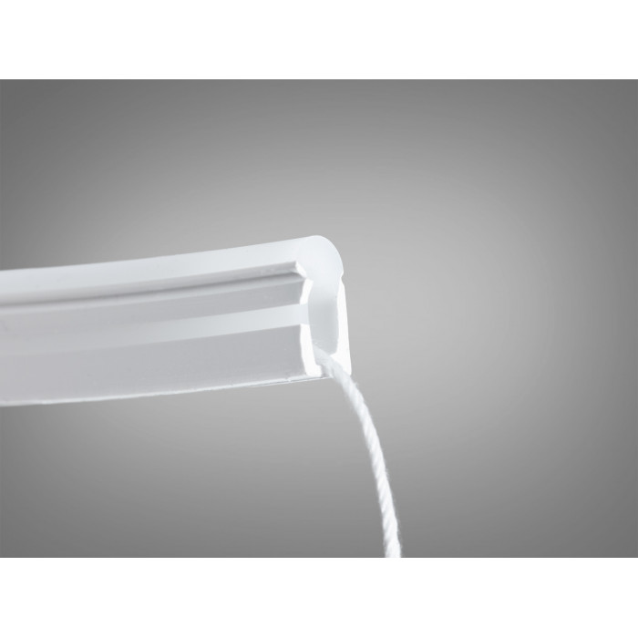 Світлодіодний силіконовий гнучкий профіль 0613 створює рівномірну безточкову лінію світла для інтер’єру та вулиці. Білий колір корпуса, компактний перетин 6×13 мм і клас захисту IP67 (за умови правильної герметизації кінців) дозволяють застосовувати його у вологих приміщеннях та на фасаді. Профіль розрахований на монтаж LED стрічки шириною до 8 мм, а внутрішній протяжний шнур у каналі спрощує установку й обслуговування. Рекомендована щільність стрічки не менше 90 LED/м в однорядному виконанні для рівного світіння без «точок».