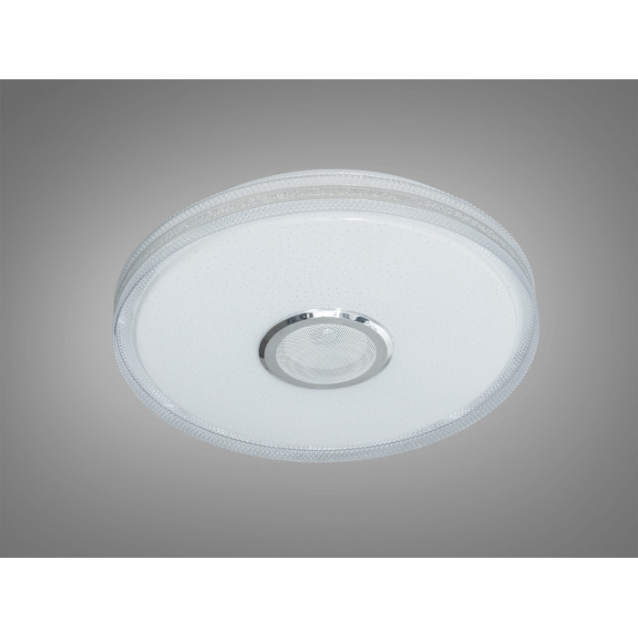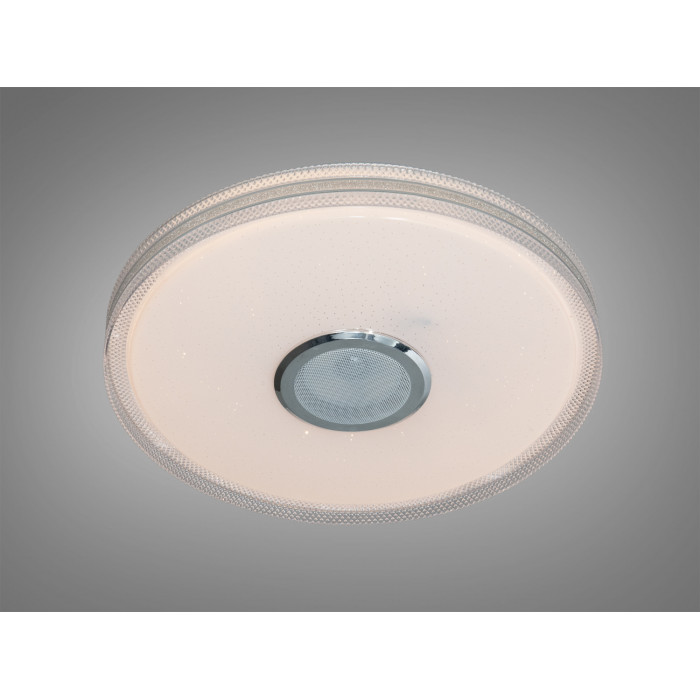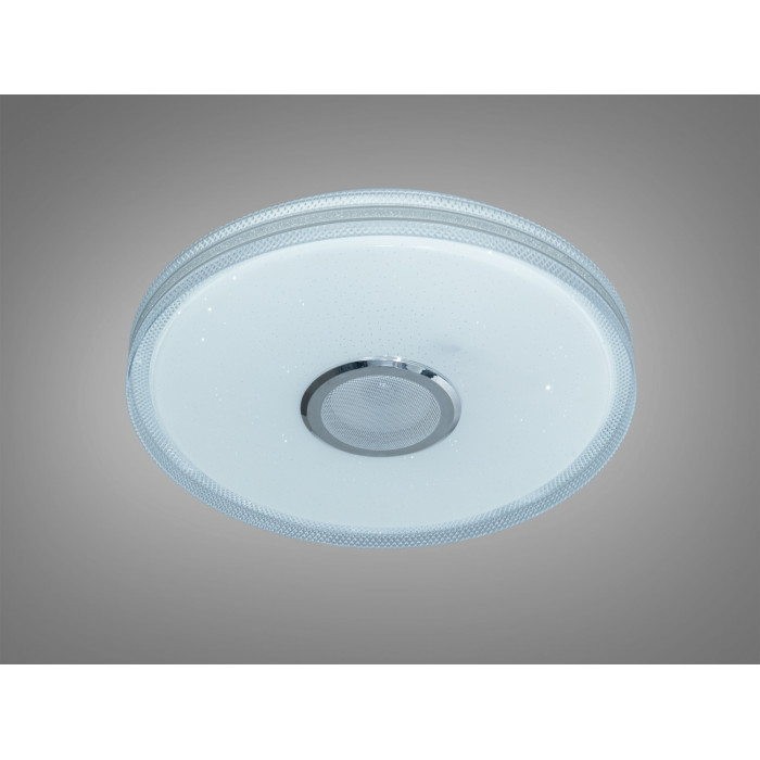 Розумна стельова люстра Diasha у білому кольорі поєднує освітлення та звук у одному корпусі. Модель передбачає потужність близько 70 Вт, чого зазвичай достатньо для кімнат площею до 12 м² за умови стандартної висоти стелі. Круглий форм-фактор з матовим розсіювачем забезпечує м’яке рівномірне світло, а декоративний прозорий обід може створювати ефект зоряного неба залежно від режиму підсвічування.