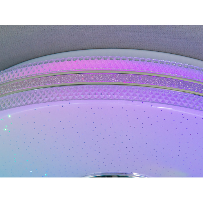 Світильник має білий корпус зі гладкою поверхнею і матовий розсіювач, що допомагає уникати сліпіння та забезпечує рівномірний розподіл світла. Кругла форма пасує до сучасних інтер’єрів та низьких стель. Прозорий обід задіюється у декоративних режимах, створюючи легкий зоряний ефект. Конструкція передбачає накладний монтаж на тверду стелю з надійним кріпленням.