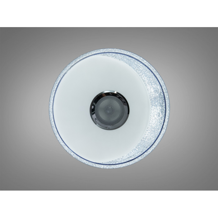 Розумна стельова люстра Diasha у білому кольорі поєднує освітлення та звук у одному корпусі. Модель передбачає потужність близько 70 Вт, чого зазвичай достатньо для кімнат площею до 12 м² за умови стандартної висоти стелі. Круглий форм-фактор з матовим розсіювачем забезпечує м’яке рівномірне світло, а декоративний прозорий обід може створювати ефект зоряного неба залежно від режиму підсвічування.