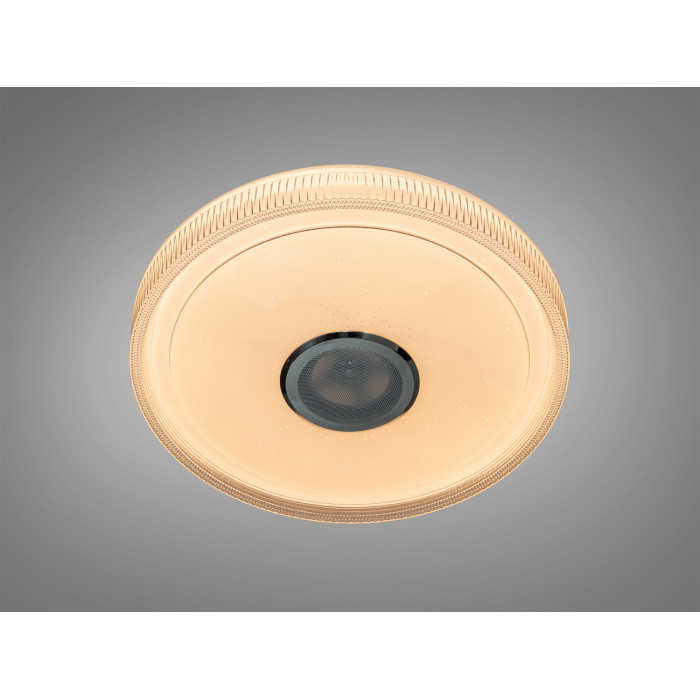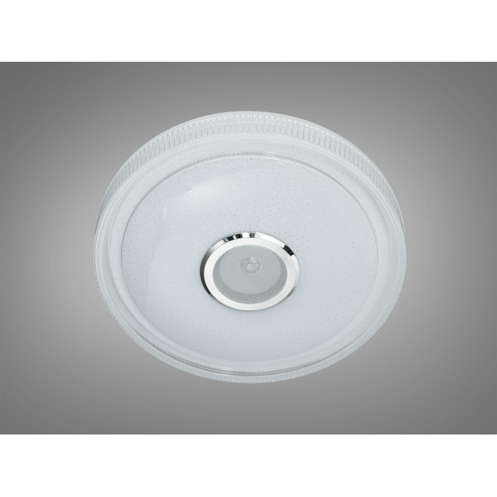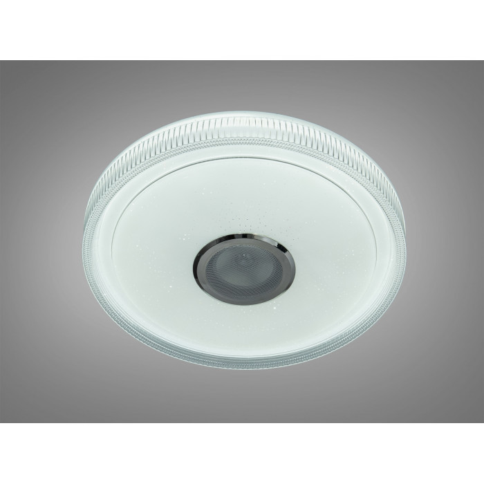 Розумна стельова люстра Diasha у білому кольорі поєднує освітлення та звук у одному корпусі. Модель передбачає потужність близько 70 Вт, чого зазвичай достатньо для кімнат площею до 12 м² за умови стандартної висоти стелі. Круглий форм-фактор з матовим розсіювачем забезпечує м’яке рівномірне світло, а декоративний прозорий обід може створювати ефект зоряного неба залежно від режиму підсвічування.