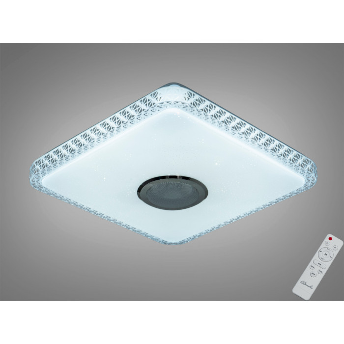 Розумна стельова люстра Diasha у білому кольорі поєднує освітлення та звук у одному корпусі. Модель передбачає потужність близько 70 Вт, чого зазвичай достатньо для кімнат площею до 12 м² за умови стандартної висоти стелі. Круглий форм-фактор з матовим розсіювачем забезпечує м’яке рівномірне світло, а декоративний прозорий обід може створювати ефект зоряного неба залежно від режиму підсвічування.