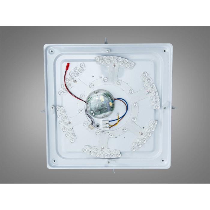 Світильник має білий корпус зі гладкою поверхнею і матовий розсіювач, що допомагає уникати сліпіння та забезпечує рівномірний розподіл світла. Кругла форма пасує до сучасних інтер’єрів та низьких стель. Прозорий обід задіюється у декоративних режимах, створюючи легкий зоряний ефект. Конструкція передбачає накладний монтаж на тверду стелю з надійним кріпленням.