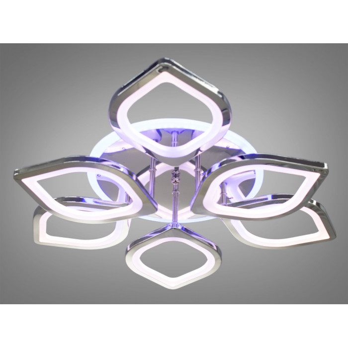 Ці елементи, зроблені із металу та акрилу, розташовані на кількох рівнях, створюючи об'ємний і динамічний вигляд. Освітлення пристельової круглої основи має теплий червоний відтінок, що робить загальний вигляд м'яким та привітним. Люстра на пульті, що дозволяє регулювати рівень освітлення та колірну температуру. Діодна люстра має декілька режимів: холодний 6000К, нейтральний 4100К, теплий 3200К, синє LED підсвічування, червоне LED підсвічування, рожеве LED підсвічування, поєднаний режим - будь основне світло плюс будь-який колір світлодіодного підсвічування - все залежить від вашого настрою.