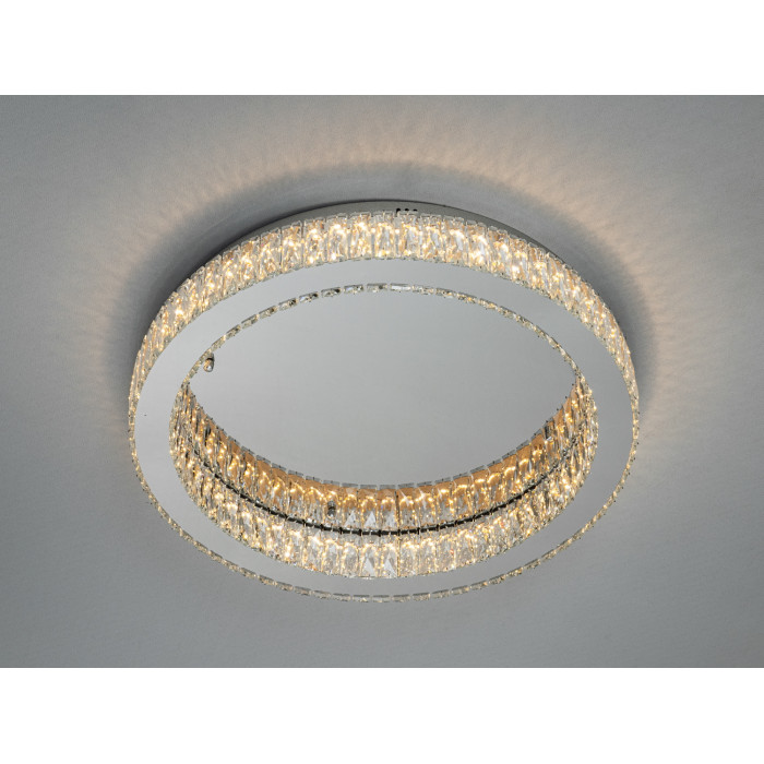 Стельова кришталева LED люстра Diasha у хромованому виконанні поєднує сучасну світлодіодну технологію та класичний блиск кришталю. Модель розрахована на 70 Вт потужності, монтується впритул до стелі та керується пультом дистанційного керування для максимальної зручності у щоденному використанні. Такий формат освітлення часто обирають для основного світла у житлових просторах, де важлива чиста геометрія стелі, відсутність громіздких підвісів і виразна гра відбиттів на кришталевих гранях.