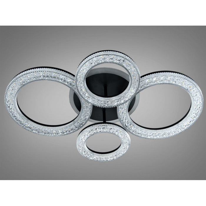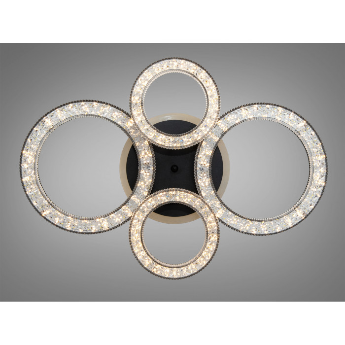 Це стельовий LED-світильник з чотирма кільцями, інкрустованими кристалами, який передбачає рівномірне загальне освітлення та ефектні відблиски на поверхнях. Завдяки потужності 72 W модель може забезпечувати комфортний рівень світла в кімнатах площею близько 12 м². Корпус виконано в чорному кольорі, що візуально підкреслює геометрію кілець і поєднується з сучасними інтер’єрами. Керування здійснюється з пульта — зручно змінювати яскравість і вмикати світло, не підходячи до вимикача.