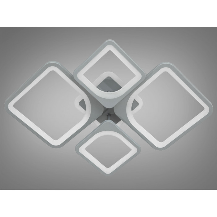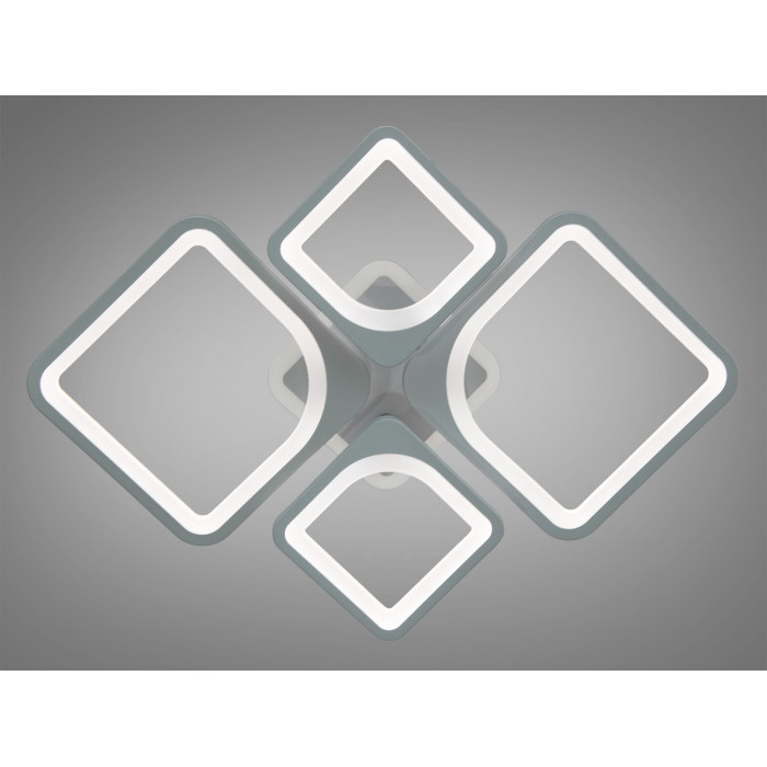 Корпус виконаний у сірому кольорі, що легко поєднується з нейтральними та контрастними палітрами. Акрилові плафони створюють м’яке розсіювання без різких тіней і бликів. Композиція з чотирьох квадратних модулів візуально додає простору, а низький профіль дає змогу встановлювати люстру там, де підвісні моделі виглядають громіздко.